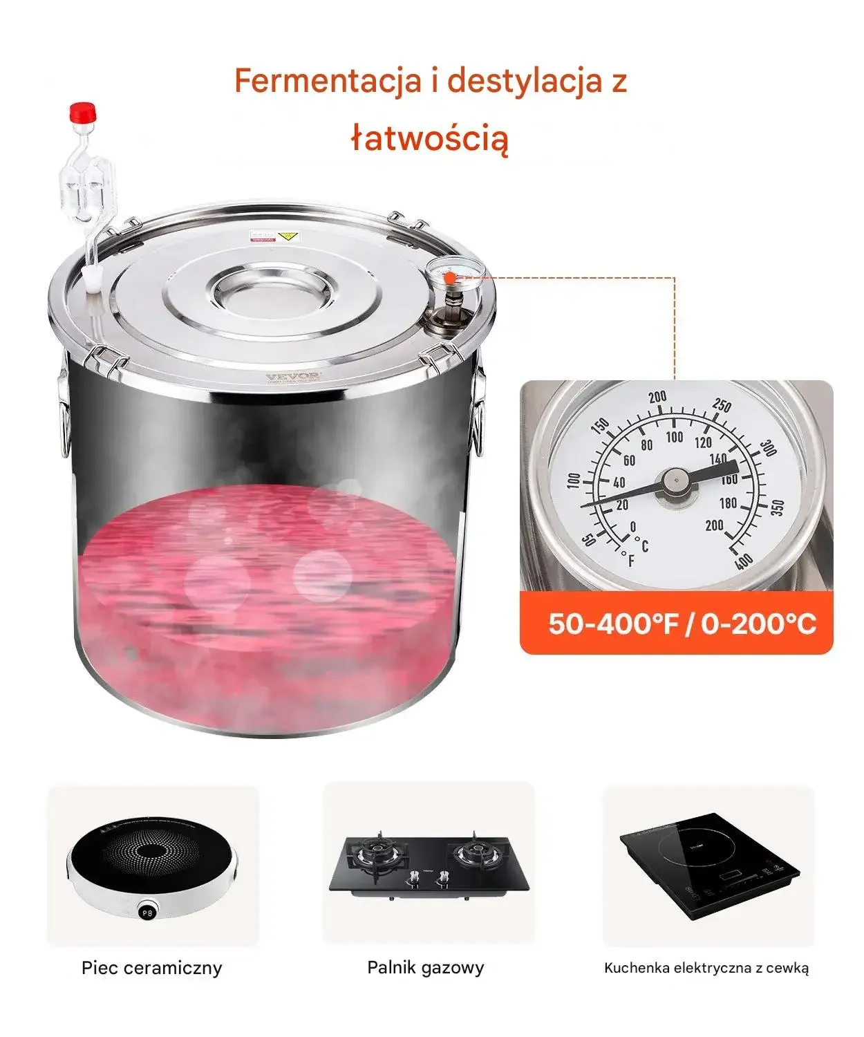 Zestaw umożliwia fermentację i destylację z łatwością. W opisie przewidziano różne źródła ciepła: piec ceramiczny, palnik gazowy lub kuchenkę elektryczną z cewką. Kolor i elementy konstrukcyjne wskazują na wykorzystanie m.in. cewek/chłodzenia oraz rozwiązań wspierających pracę układu podczas procesu destylacji.