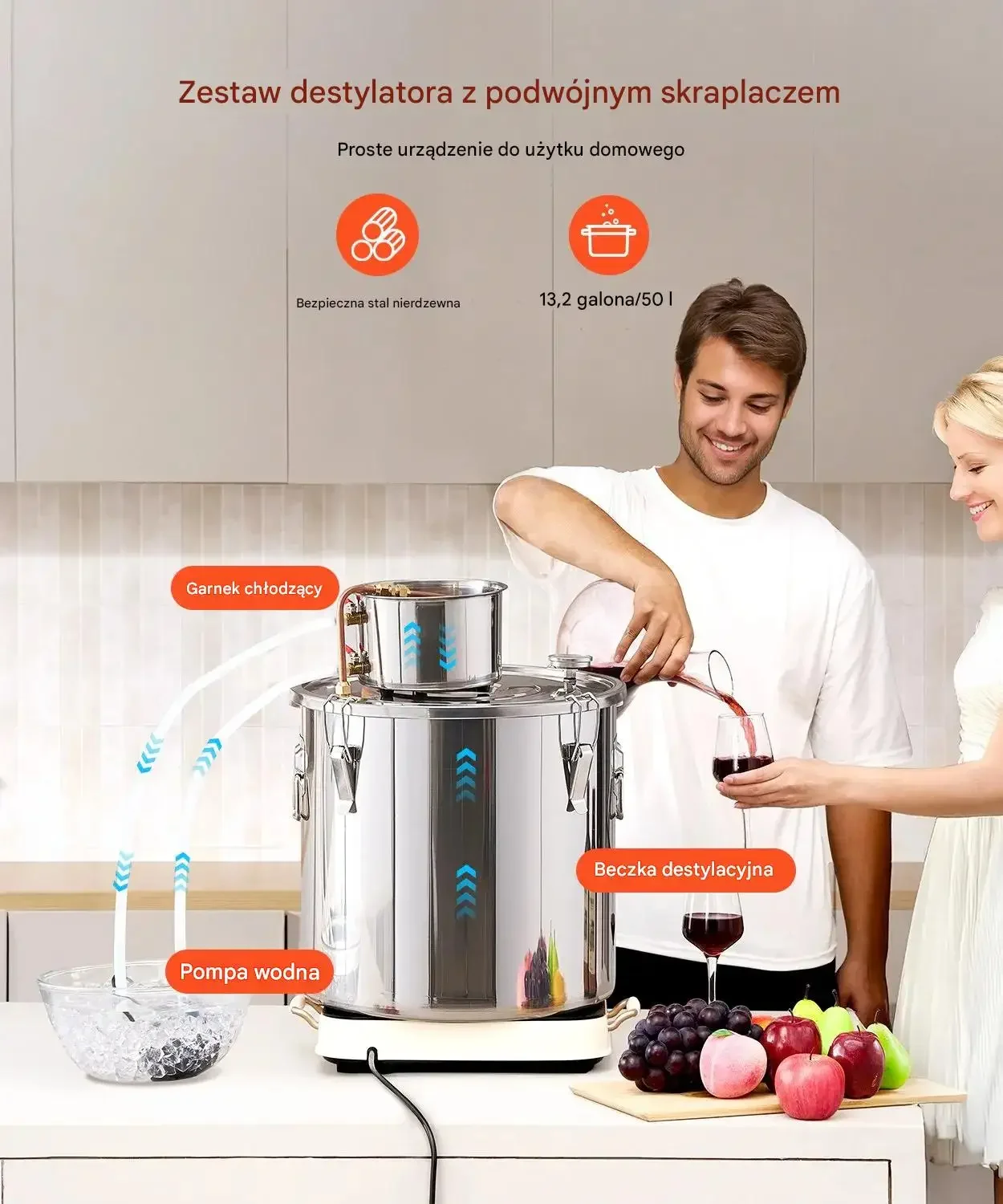Zestaw destylatora z podwójnym skraplaczem jest przeznaczony do użytku domowego. Pojemność 50,0 litra.