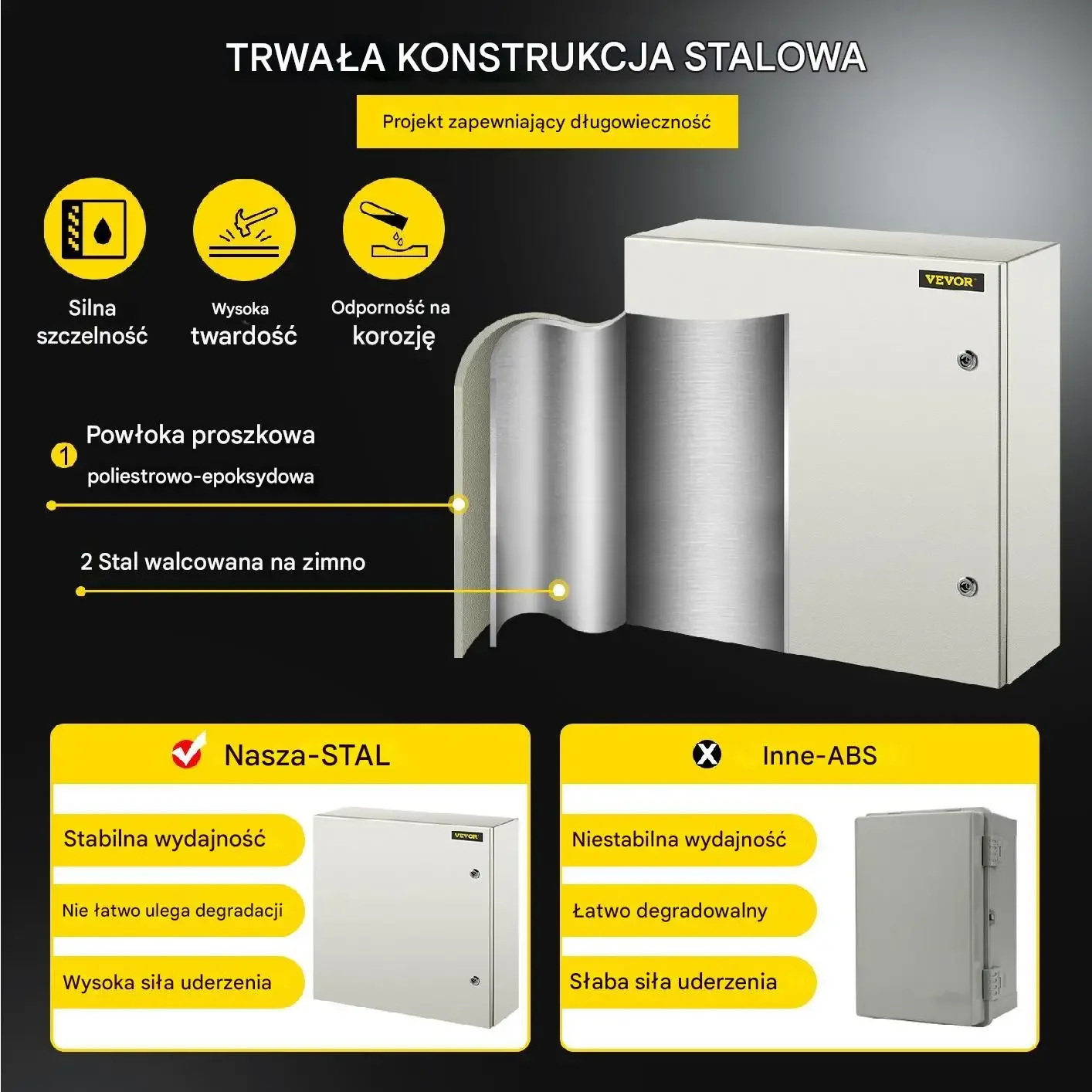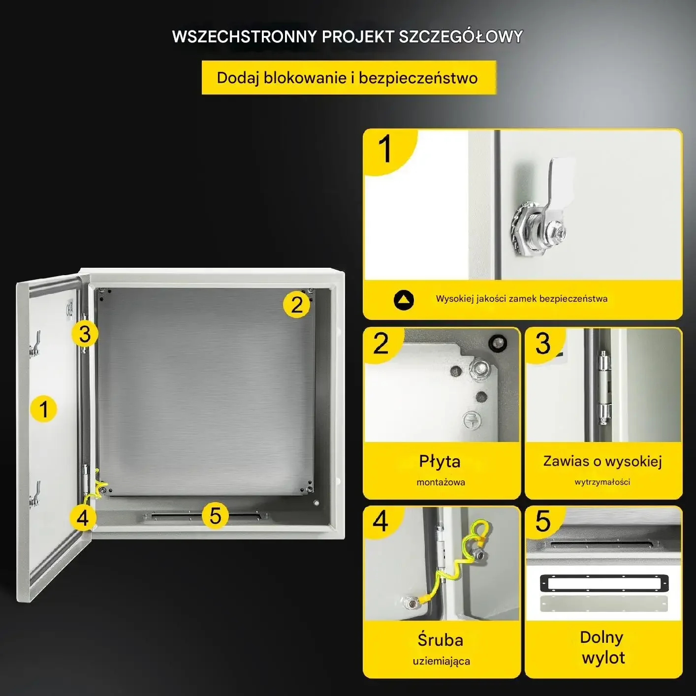 Wykonane z 1,5 mm zimno walcowanej stali, precyzyjnie cięte i spawane. Nasze obudowy elektryczne posiadają certyfikaty CE i ROHS, charakteryzują się wyższą odpornością na zużycie i skutecznie chronią Twoje urządzenia w trudnych warunkach.