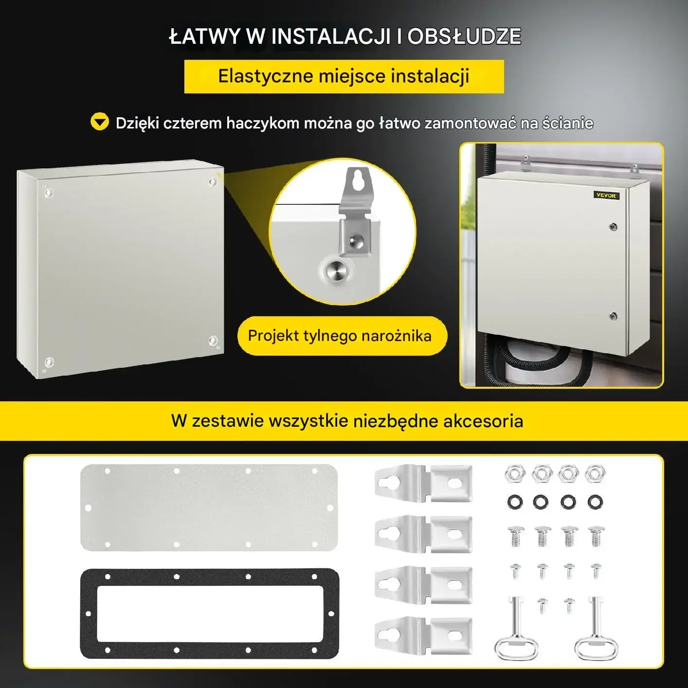 Rozdzielnica elektryczna jest wyposażona w zdejmowaną, ocynkowaną płytę montażową, co ułatwia instalację komponentów elektrycznych. Cztery otwory montażowe na tylnej ścianie umożliwiają szybkie przytwierdzenie skrzynki elektrycznej do ściany.
