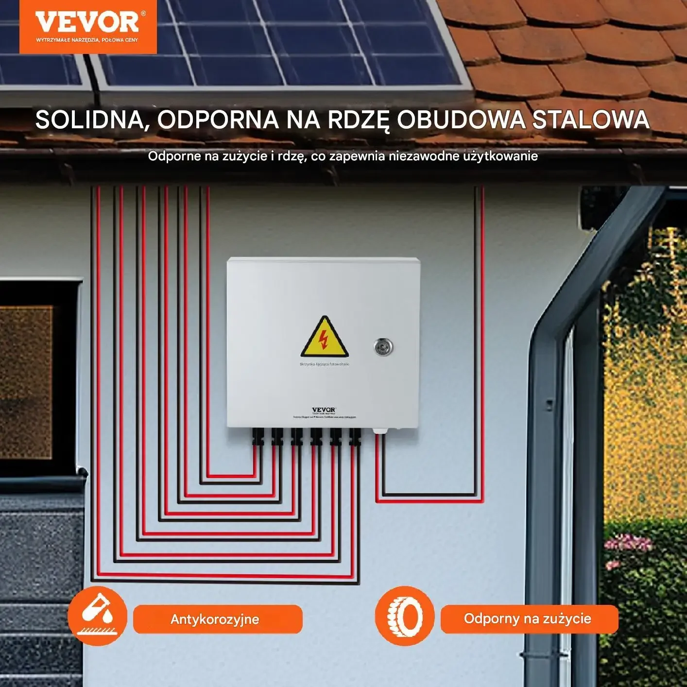 Solidna, odporna na rdzę obudowa stalowa. Odporne na zużycie i rdzę, co zapewnia niezawodne użytkowanie. Antykorozyjne i odporne na zużycie zastosowanie do instalacji paneli fotowoltaicznych z połączeniami wielu stringów.