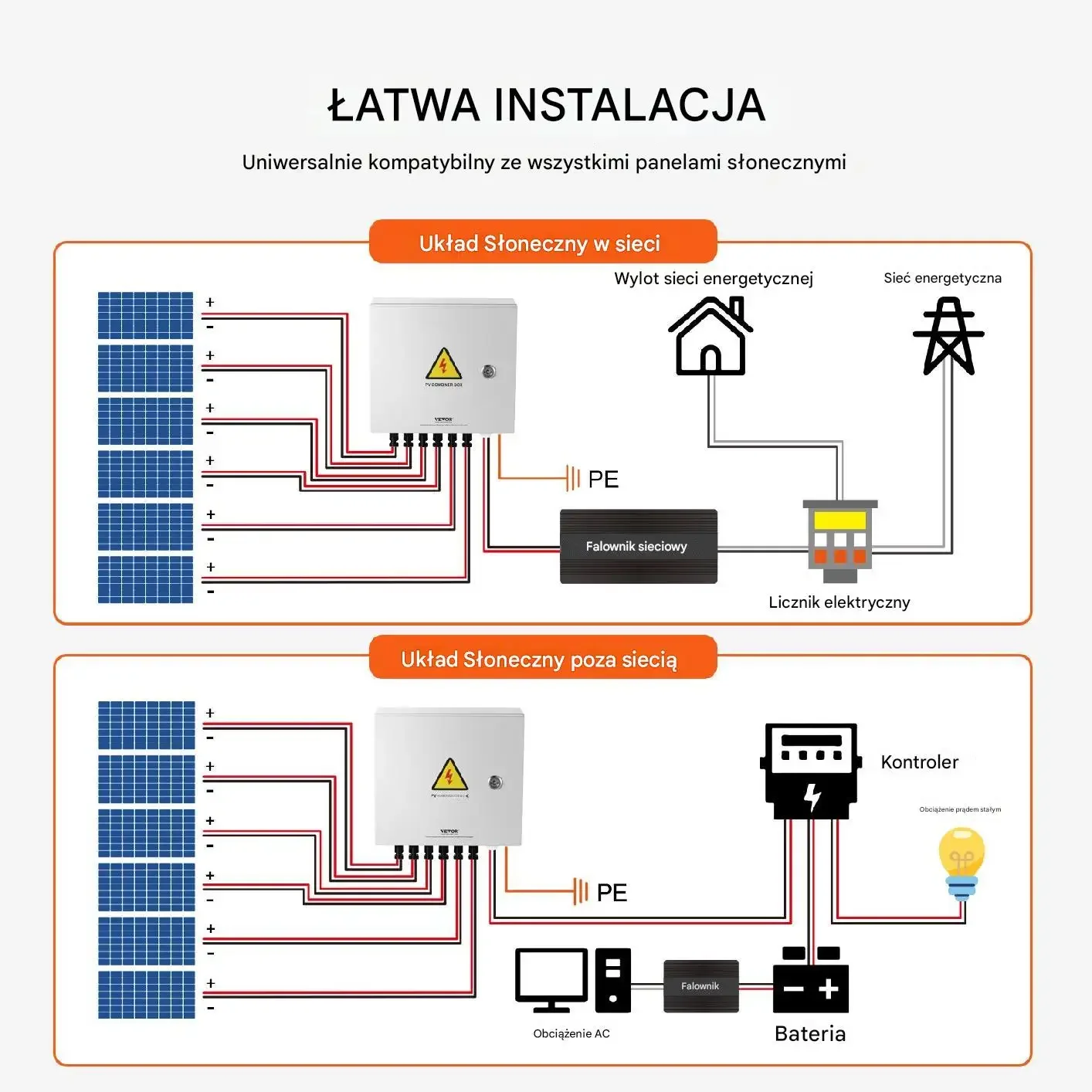 Łatwa instalacja. Uniwersalnie kompatybilny ze wszystkimi panelami słonecznymi. Układ słoneczny w sieci oraz układ słoneczny poza siecią — schematy pokazujące podłączenie paneli, puszki łączeniowej, falownika sieciowego, licznika elektrycznego, kontrolera, baterii i obciążeń AC.