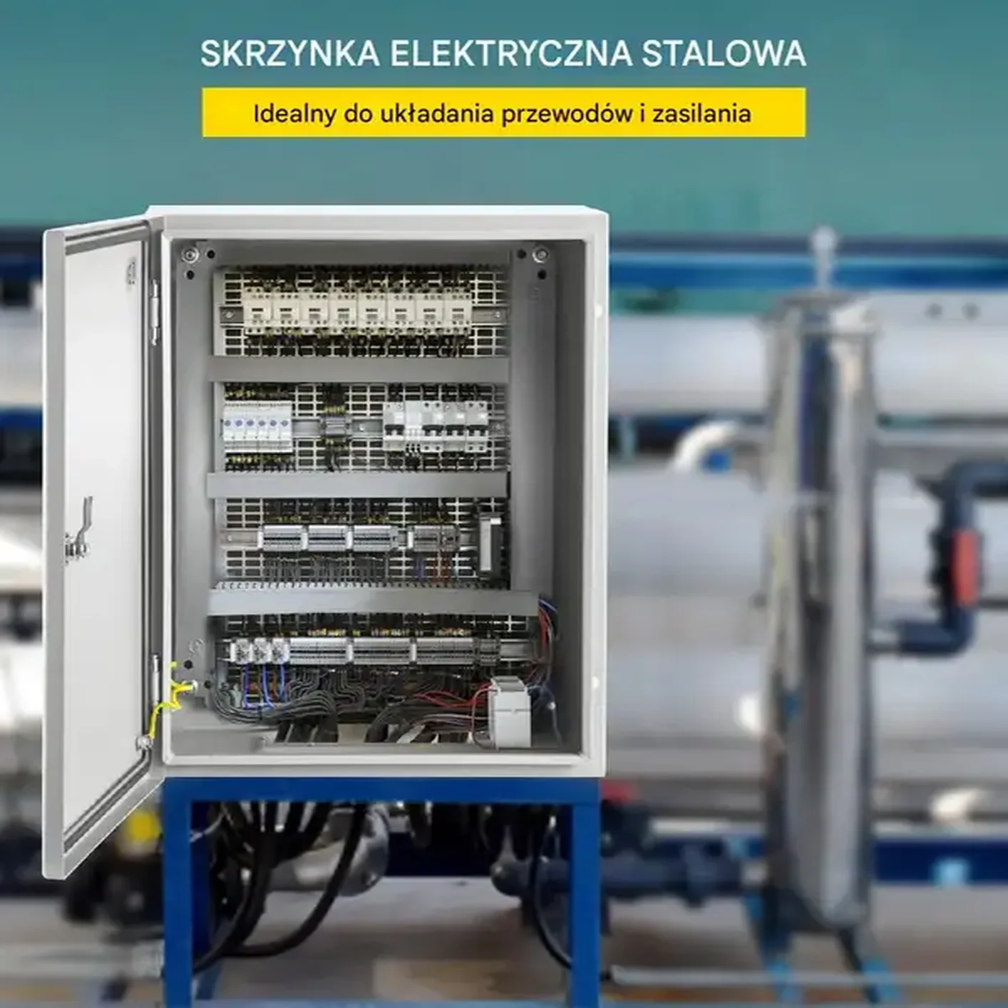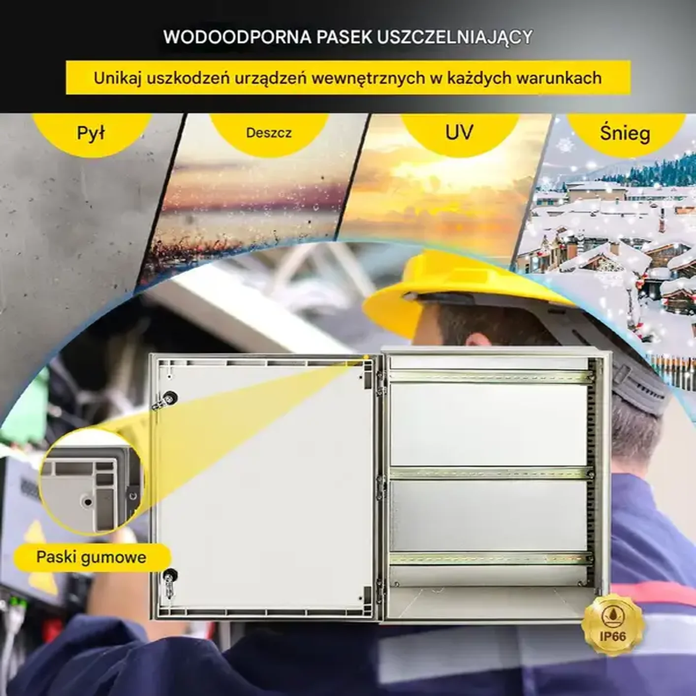 Obudowa zapewnia klasę szczelności IP66, która chroni urządzenia elektryczne przed wodą, pyłem i innymi zanieczyszczeniami. Skrzynka jest doskonałym rozwiązaniem do miejsc narażonych na działanie wilgoci, takich jak hale przemysłowe, instalacje zewnętrzne czy pomieszczenia techniczne. Dzięki doskonałej szczelności sprzęt wewnątrz pozostaje bezpieczny i niezawodny.