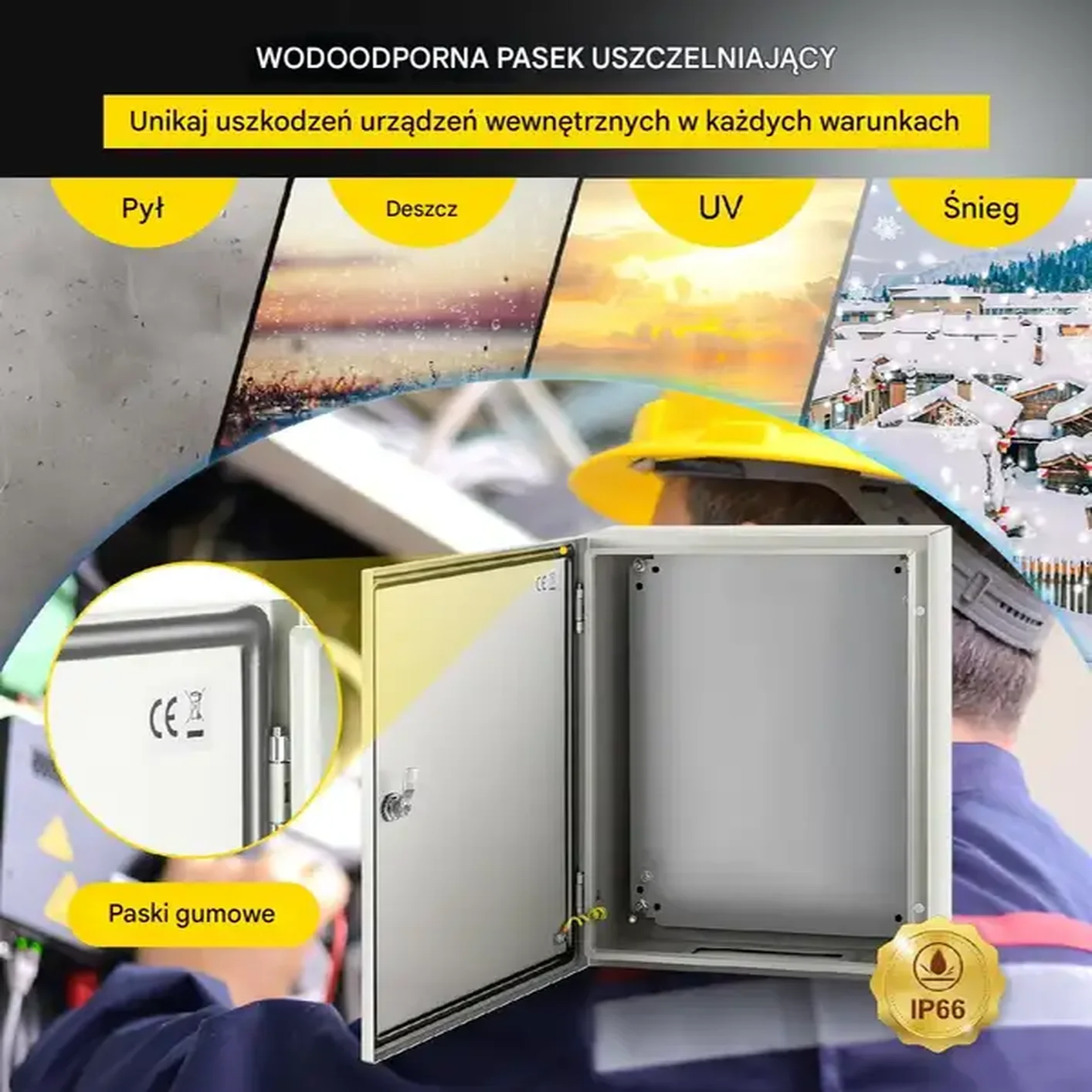 Skrzynka elektryczna o wymiarach 50x40x15 cm wykonana z wysokiej jakości włókna szklanego (SMC) to idealne rozwiązanie dla systemów elektrycznych i sterowniczych. Dzięki swojej lekkiej, a jednocześnie trwałej konstrukcji, obudowa jest odporna na uszkodzenia mechaniczne, korozję oraz wpływ trudnych warunków atmosferycznych. Klasa ochrony IP66 zapewnia pełną szczelność, co sprawia, że jest to niezawodny wybór zarówno do instalacji wewnętrznych, jak i zewnętrznych.