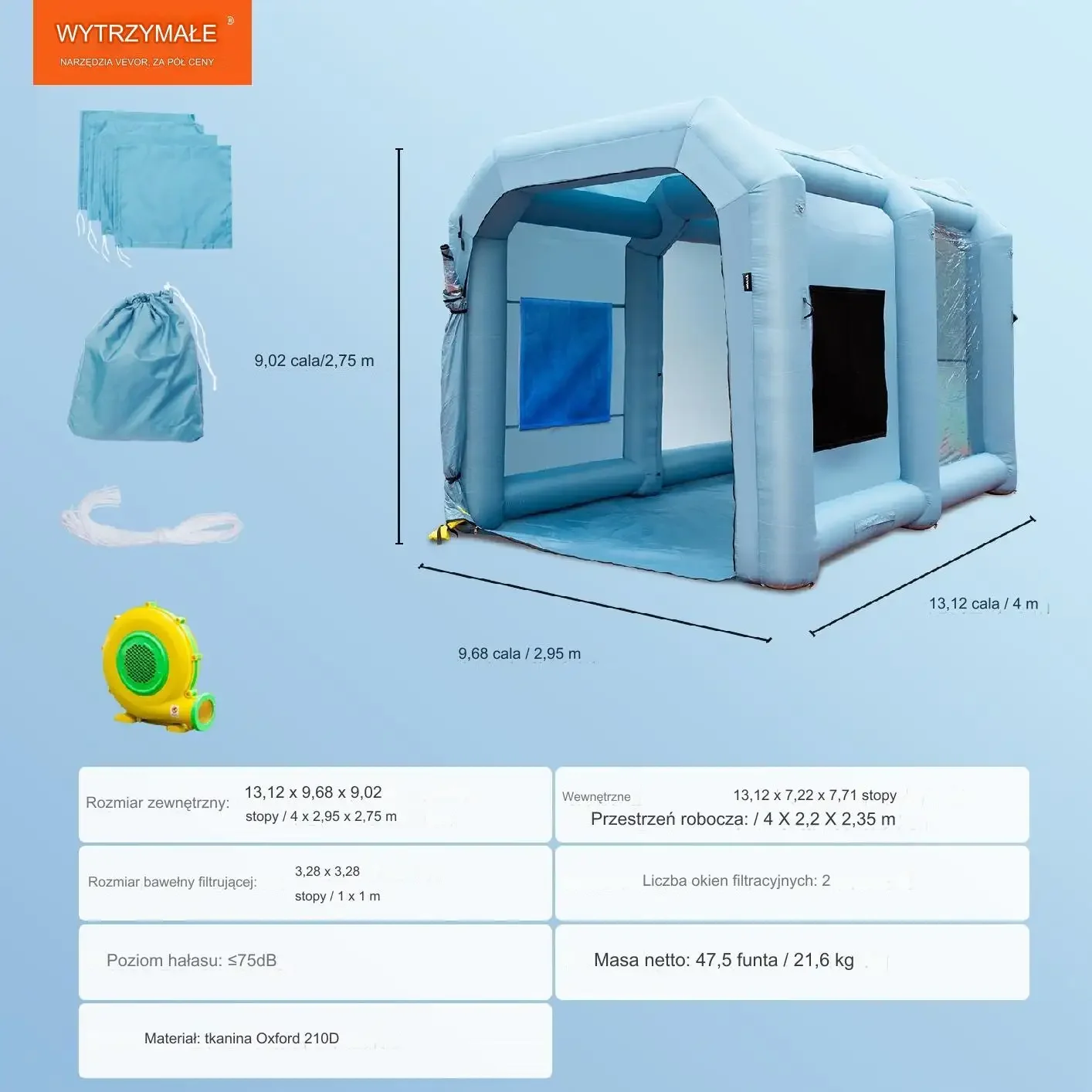 Podnieś jakość swoich prac lakierniczych z nadmuchiwanym namiotem o wymiarach 8x4x3 m! Wykonany z tkaniny Oxford 210D i PVC, wyposażony w dmuchawę 1100W i wentylator 330W, ten namiot oferuje przestronną kabinę z efektywną filtracją. Idealny do lakierowania aut, napraw i nie tylko – solidność i wszechstronność w jednym!