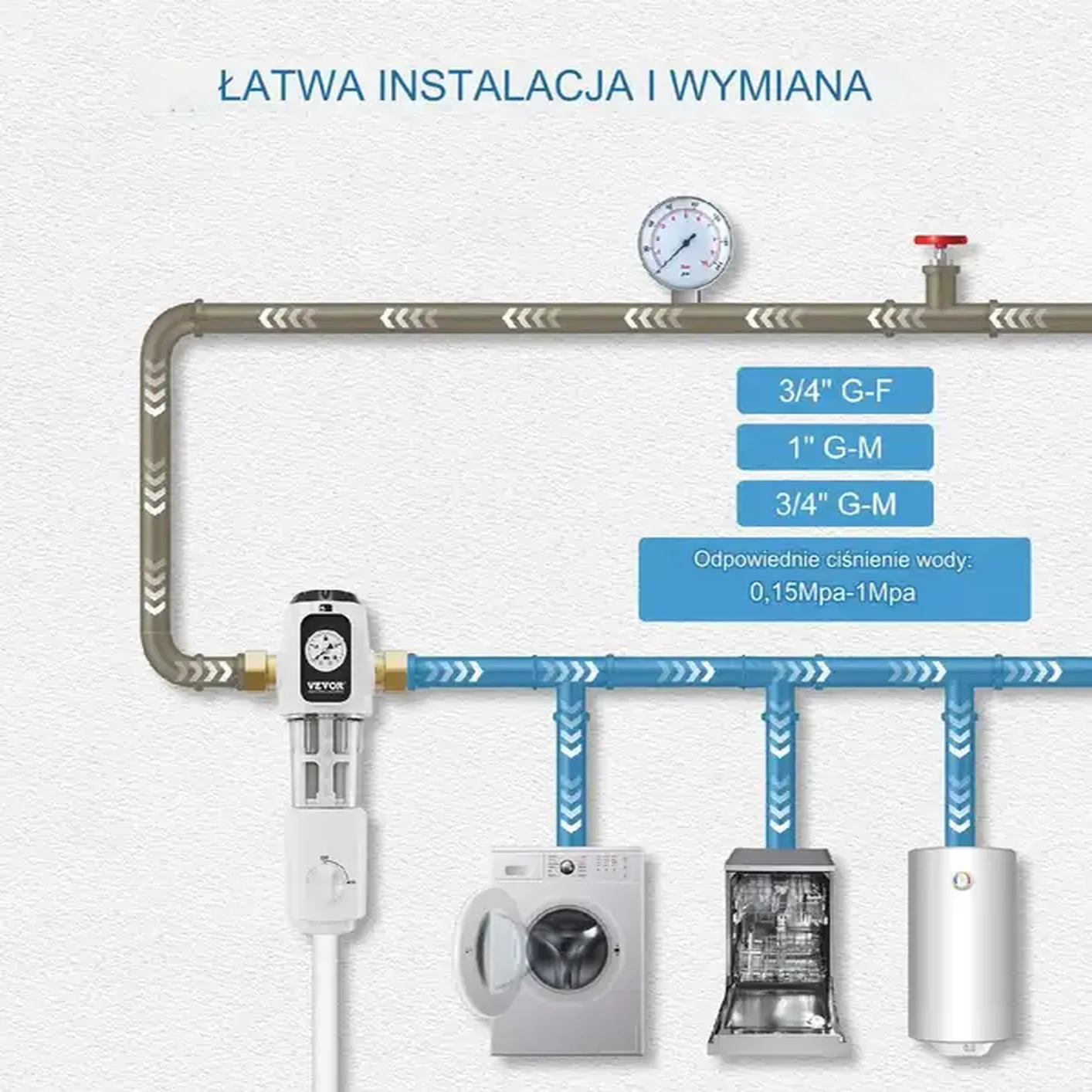 - Średnica wlotu i wylotu: 3/4″ GM (26,44 mm) + 1″ GM (33,25 mm) + 3/4″ GF (26,44 mm)