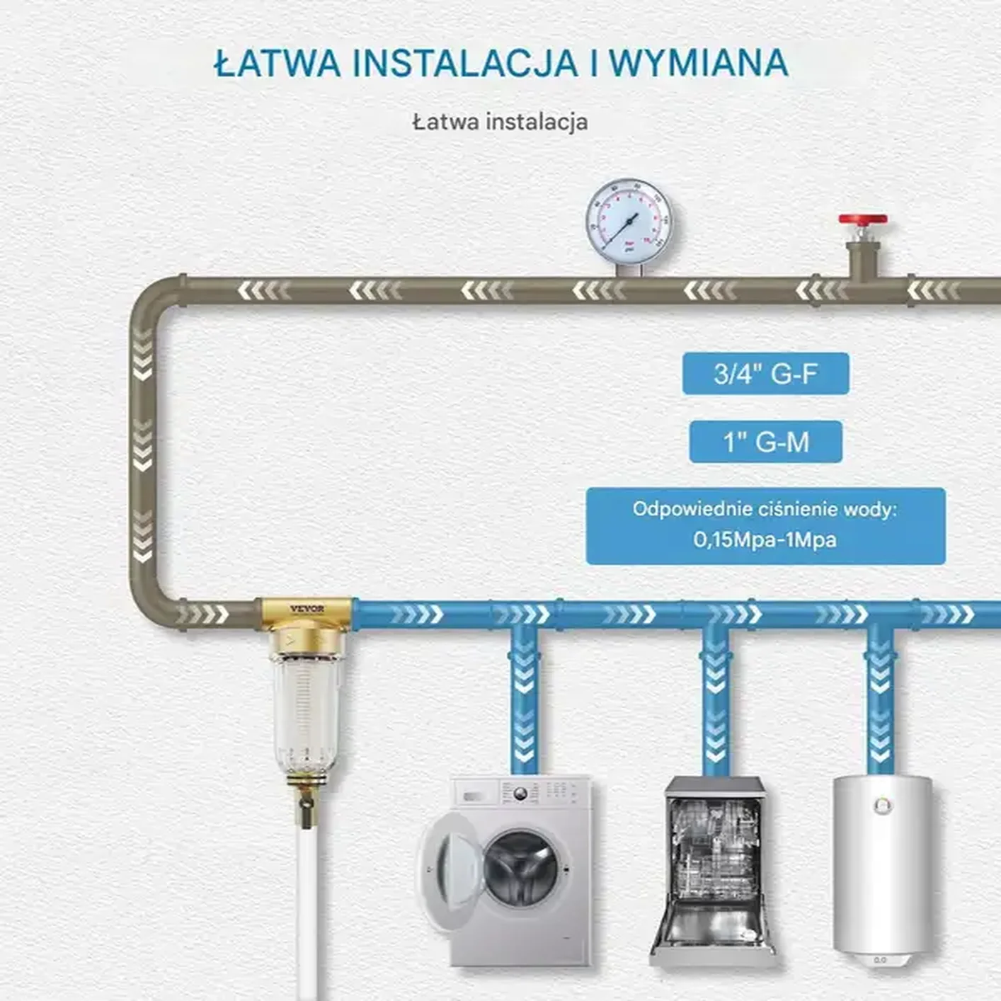 - ✅ Łatwa instalacja: Montaż na głównym przyłączu wody bez konieczności podłączenia do prądu