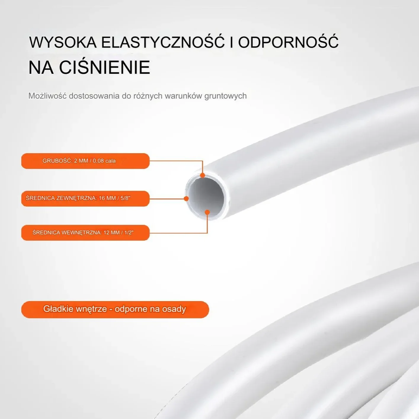 - ✅ Elastyczność i odporność na ciśnienie – Rura o średnicy 16 mm i grubości ścianki 2 mm jest elastyczna i odporna na ciśnienie, co ułatwia montaż w ciasnych narożnikach.