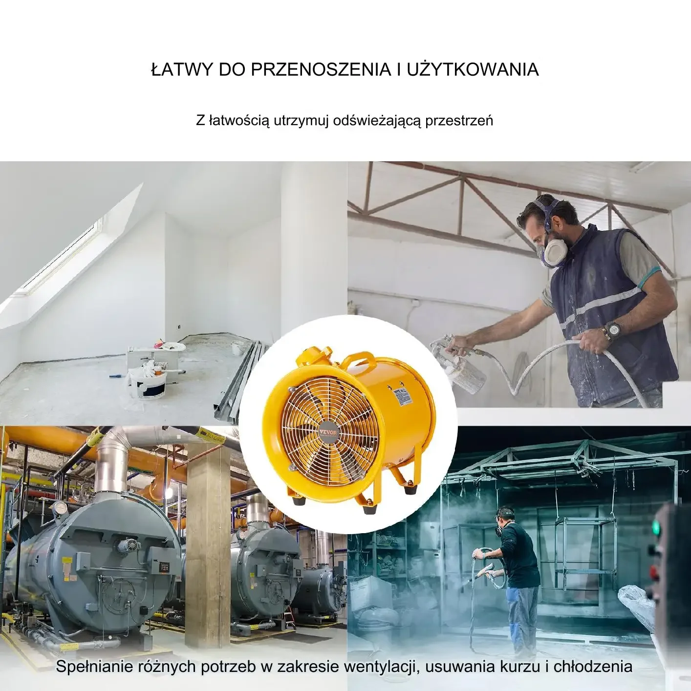 Wentylator jest lekki i łatwy do przenoszenia, co sprawia, że idealnie nadaje się do różnych zastosowań, takich jak wentylacja, usuwanie kurzu i chłodzenie.