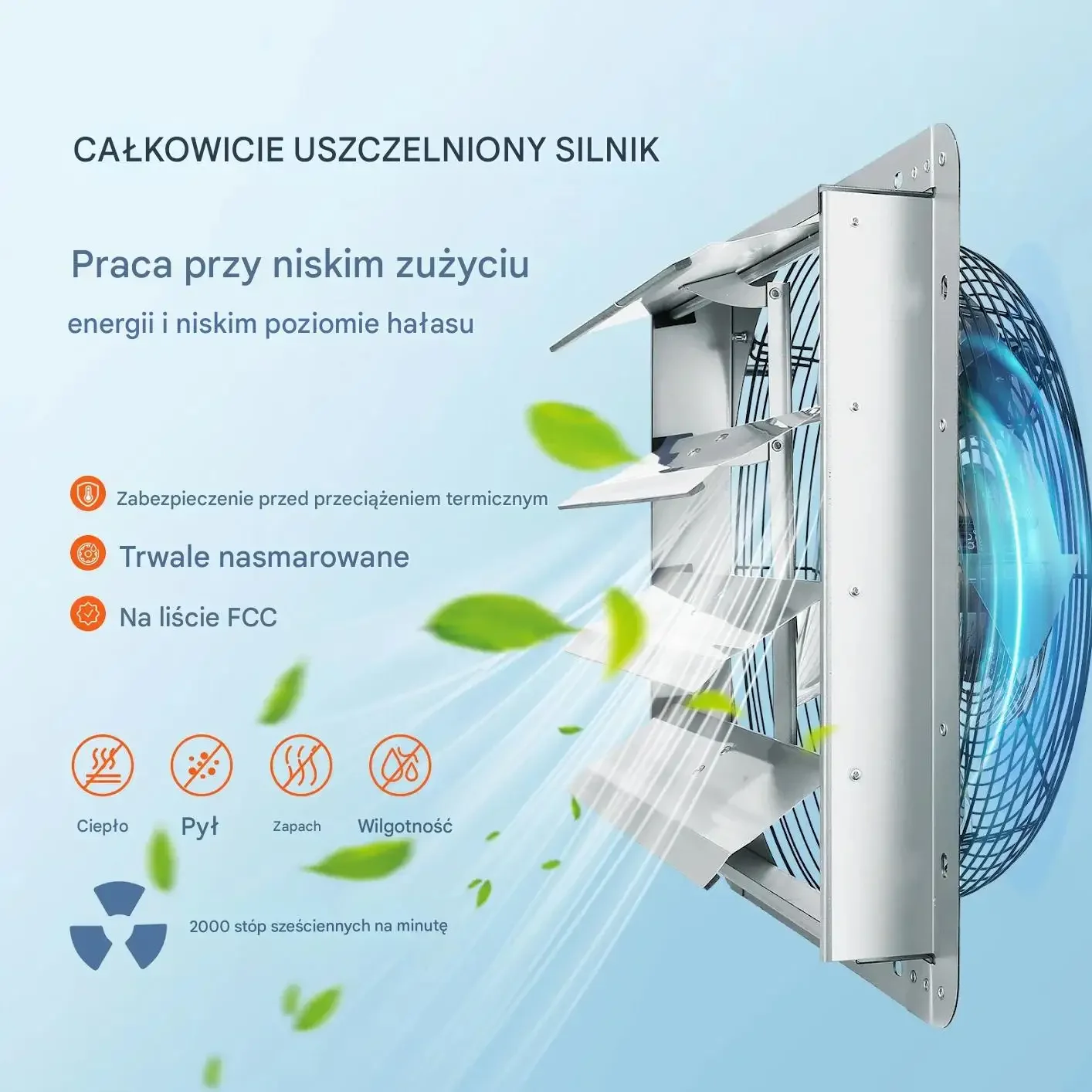 - ✅ Wysoka wydajność: Przepływ powietrza o wartości 1506 CFM (2500 m³/h) oraz prędkość obrotowa 1400 RPM zapewniają optymalną cyrkulację powietrza