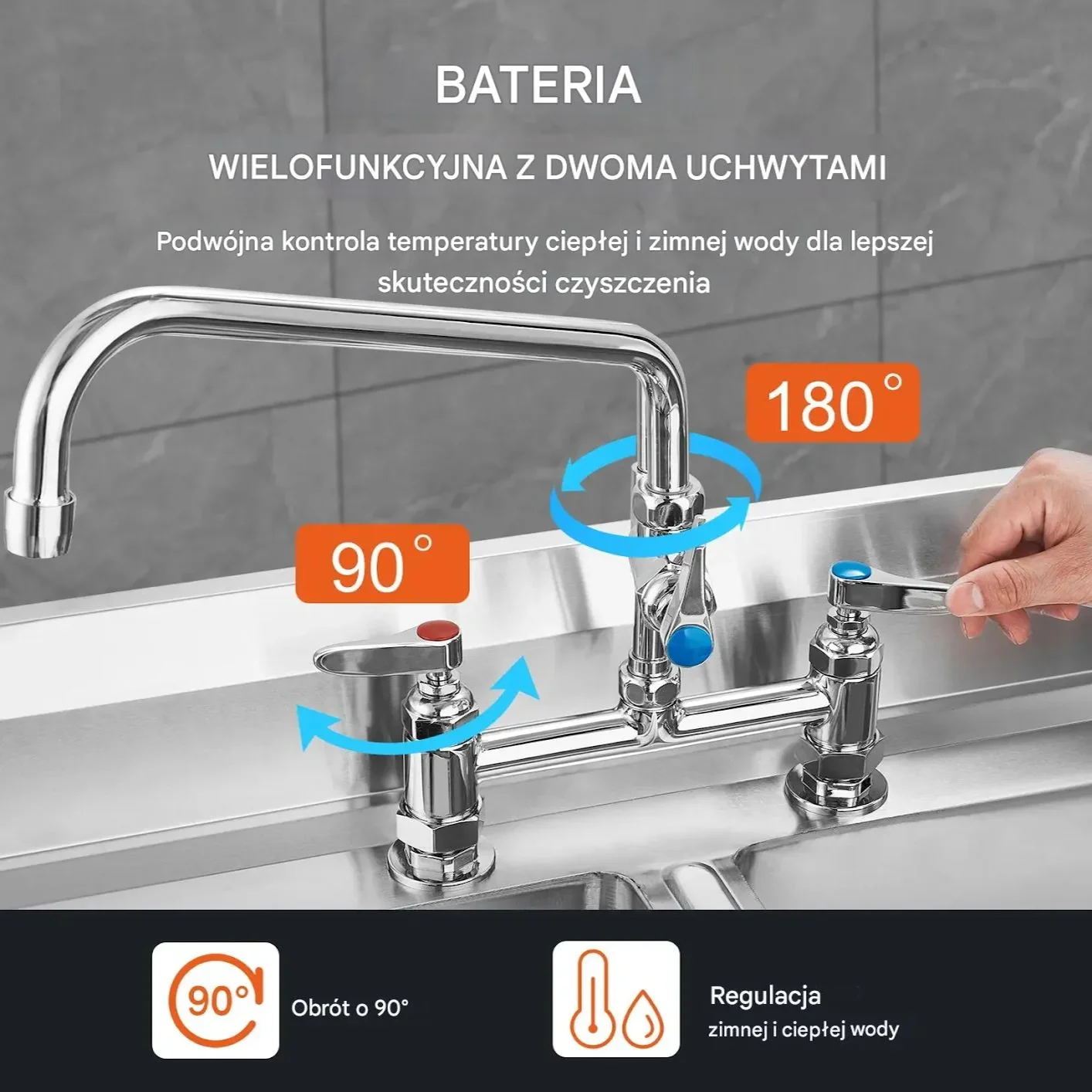 - ✅ Bateria o wysokości 66 cm: Wylewka obracana 30 cm, umożliwia łatwe mycie dużych garnków i naczyń