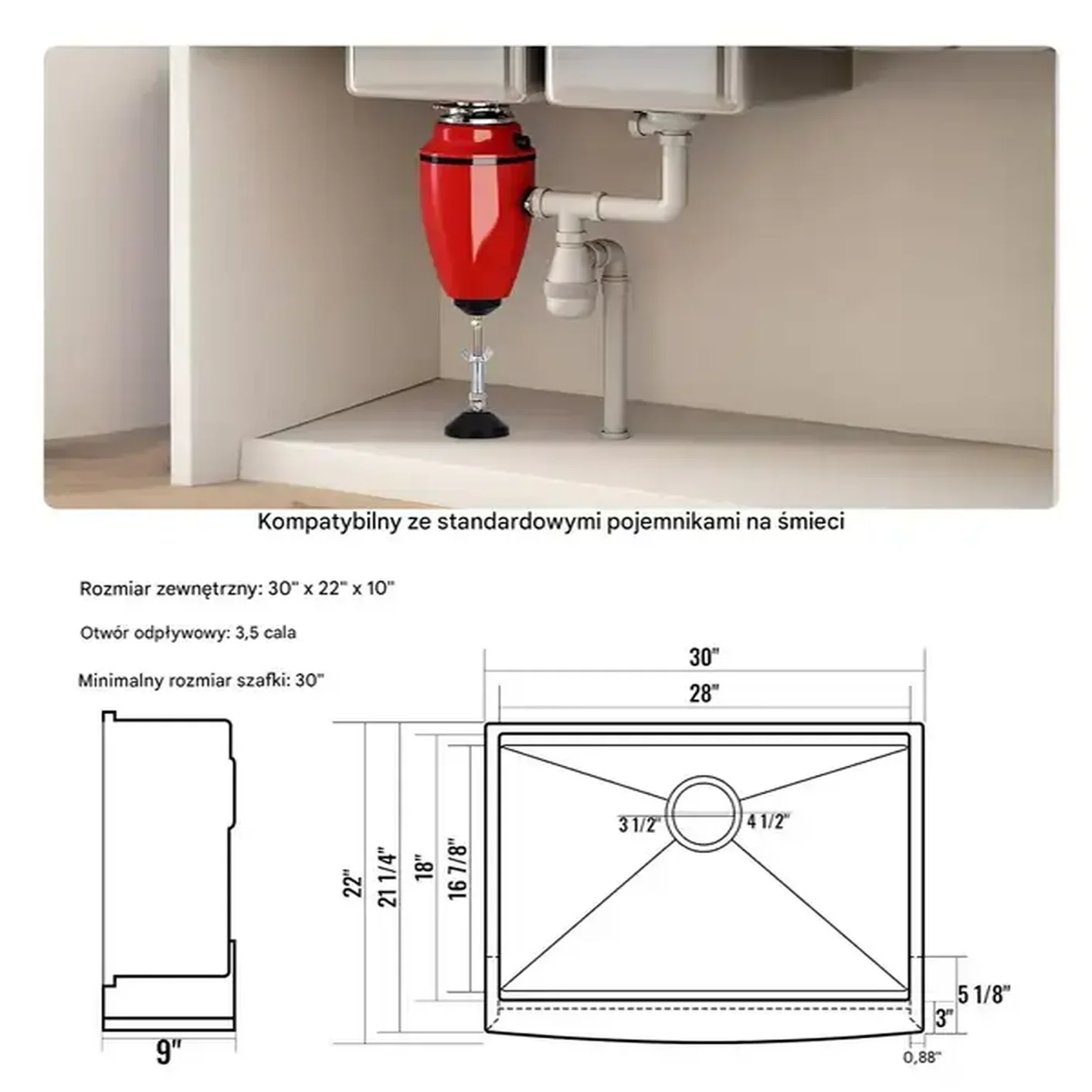 • Standardowy otwór odpływowy: 3,5 cala