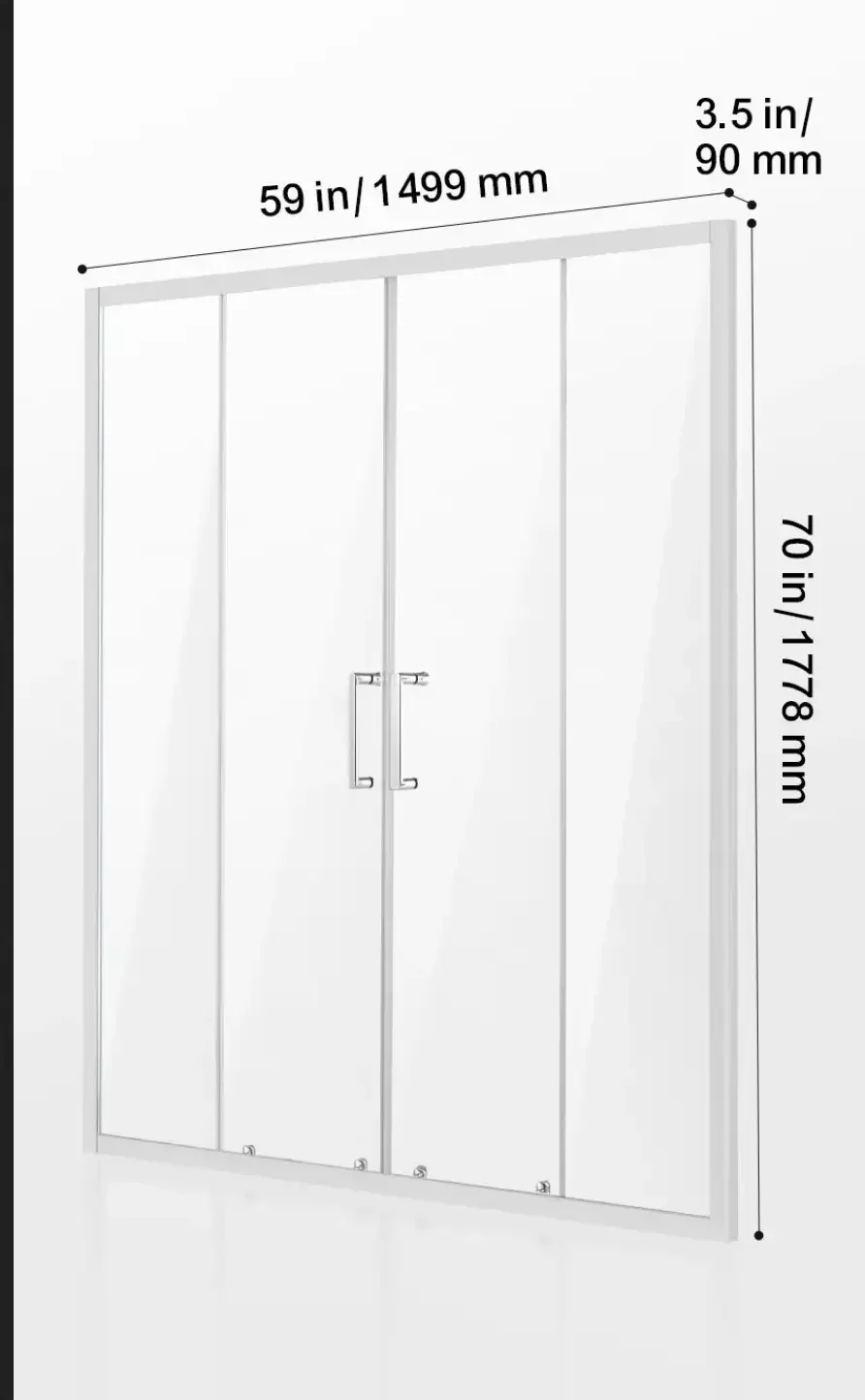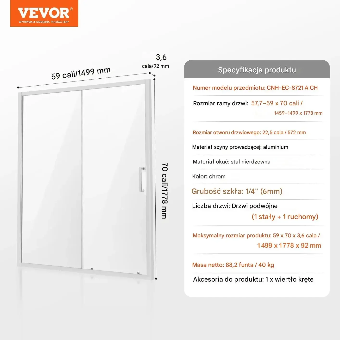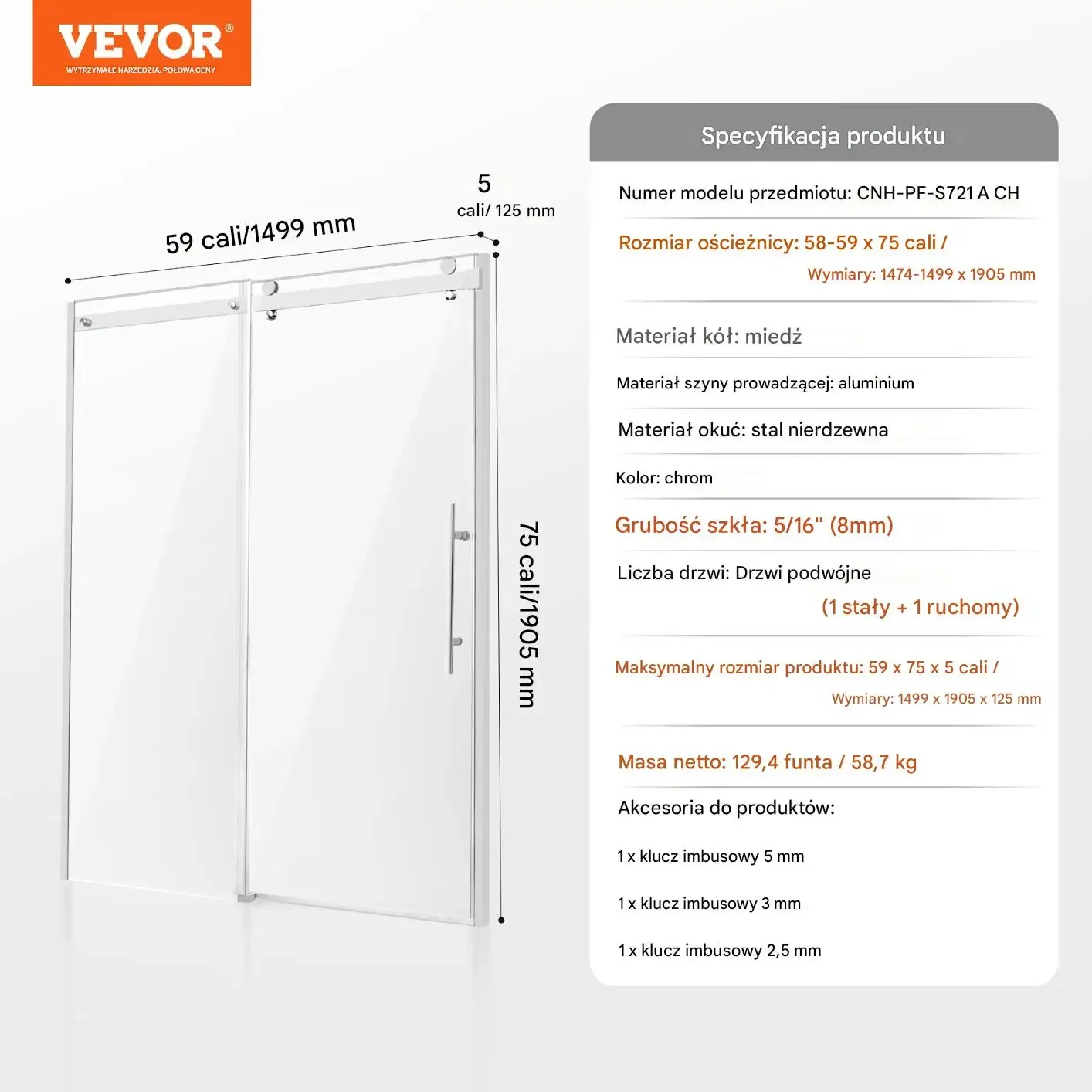 Nr modelu: CNH-PF-S721 A CH. Rozmiar ościeżnicy: 58-59 x 75 cali / 1474-1499 x 1905 mm. Materiał: aluminium, okucia stal nierdzewna, kolor: chrom. Grubość szkła: 5/16″ (8 mm). Liczba drzwi: drzwi podwójne (1 stały + 1 ruchomy). Maksymalny rozmiar produktu: 59 x 75 x 5 cali / 1499 x 1905 x 125 mm. Masa netto: 129,4 funta / 58,7 kg. Akcesoria w zestawie: klucz imbusowy 5 mm, klucz imbusowy 3 mm, klucz imbusowy 2,5 mm.