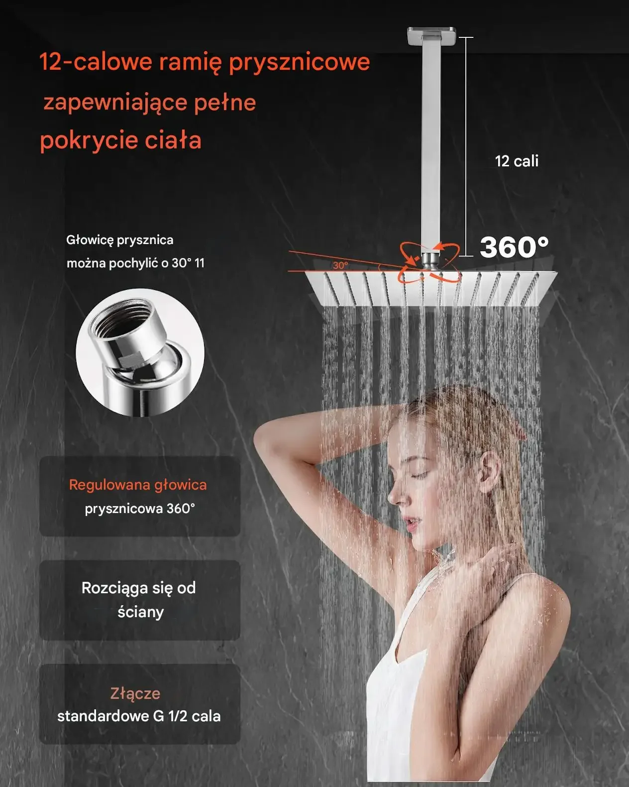 - ✅ Równomierne pokrycie wodą: Wydłużone ramię prysznicowe 30,5 cm zwiększa zasięg strumienia, zapewniając płynny i równomierny deszcz prysznicowy. Głowica obracana o 360° pozwala na dostosowanie kąta.