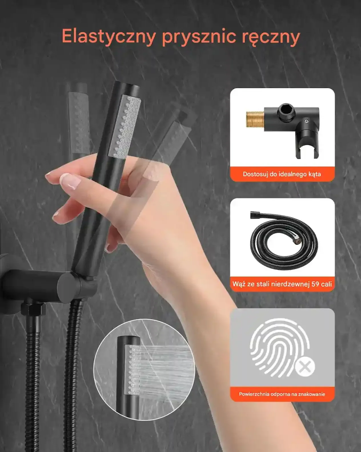 • Ergonomiczna słuchawka: Regulacja kąta i wąż stalowy 1,5 m umożliwiają wygodne kąpiele dzieci, zwierząt i czyszczenie trudno dostępnych miejsc.