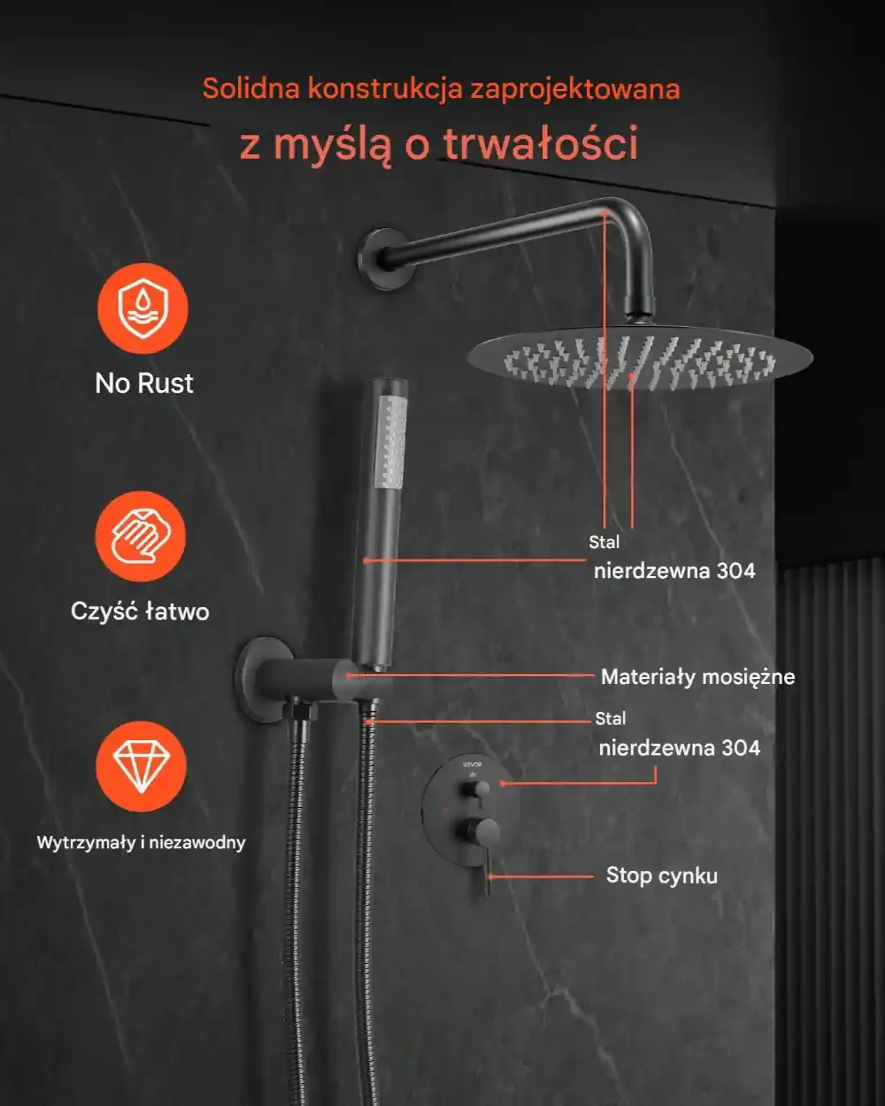• Solidna konstrukcja: Stal nierdzewna, mosiądz, stop cynku i ABS – odporne na korozję, odciski palców i zacieki. Matowe czarne wykończenie dodaje elegancji.