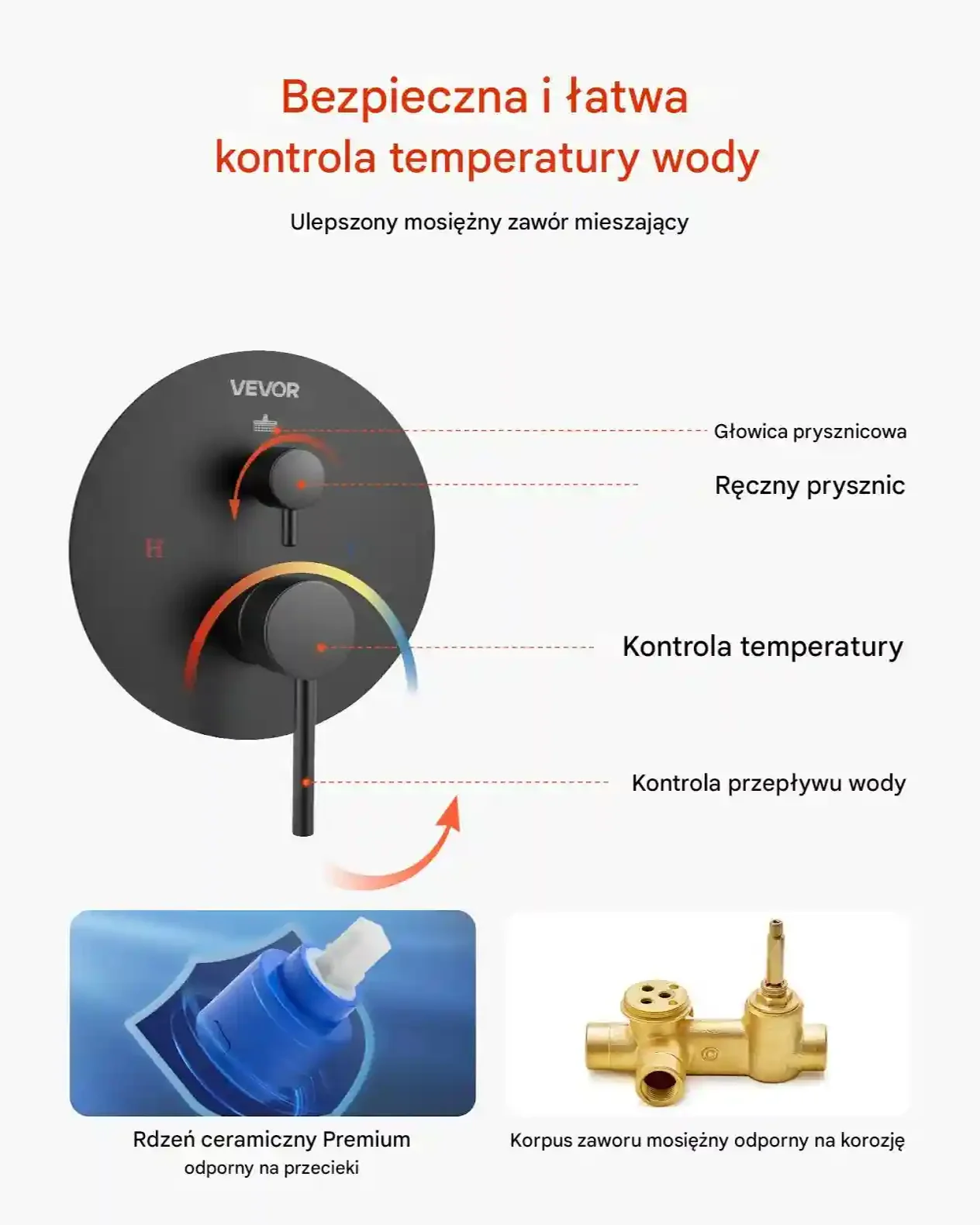 • Bezpieczna regulacja temperatury: Mosiężny zawór mieszający chroni przed poparzeniem, ceramiczny rdzeń zapewnia trwałą szczelność.