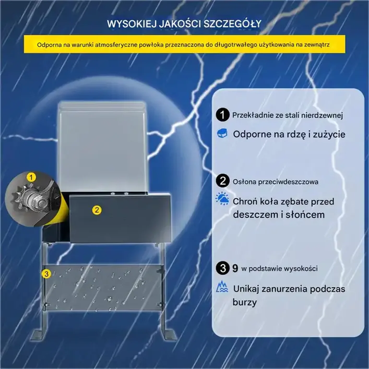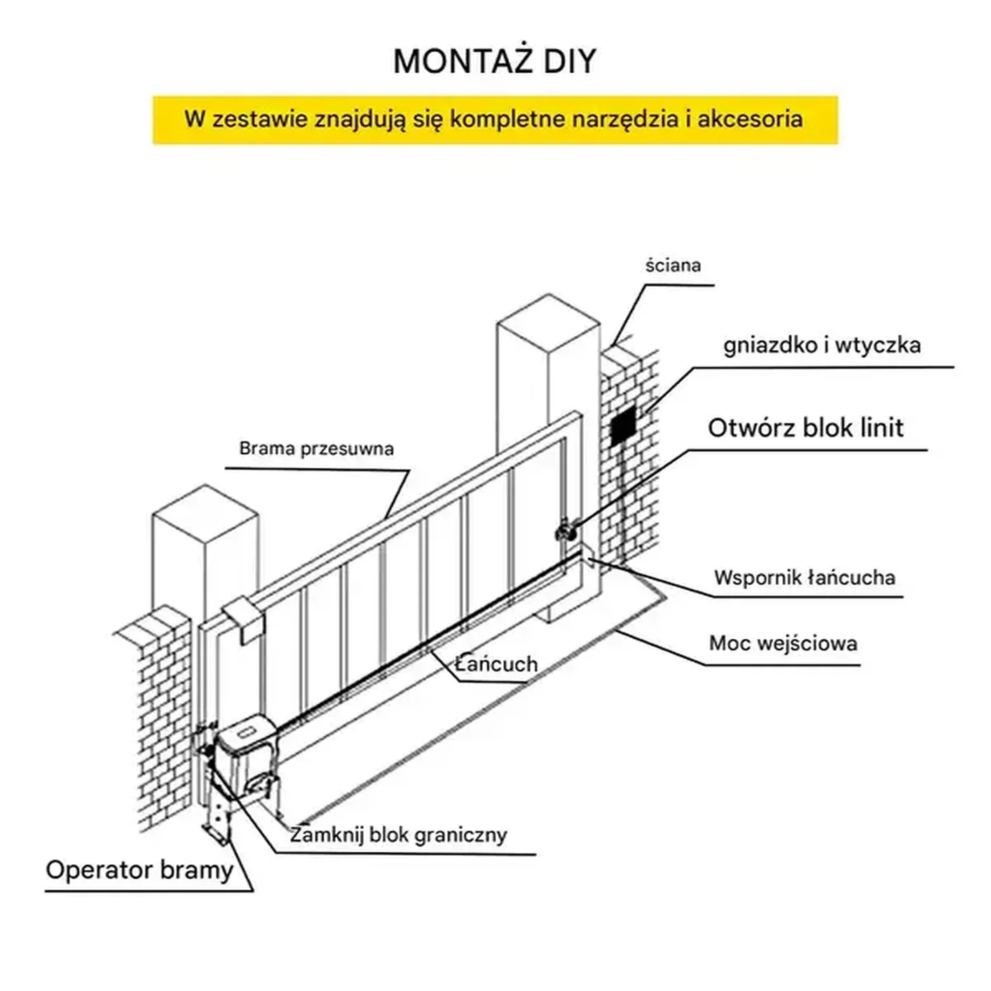 • Łatwy montaż: W zestawie znajduje się 20-metrowy łańcuch napędowy i pełen komplet akcesoriów montażowych – gotowe do instalacji od razu po rozpakowaniu.
