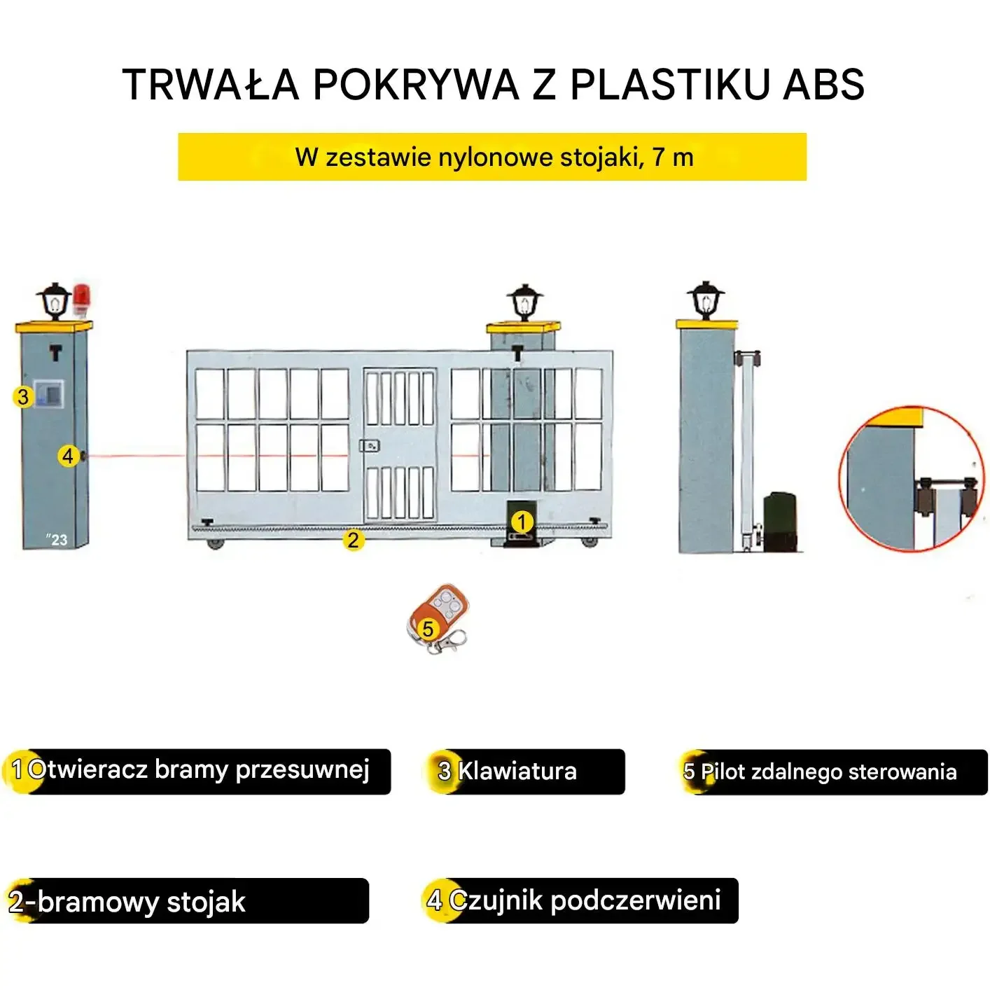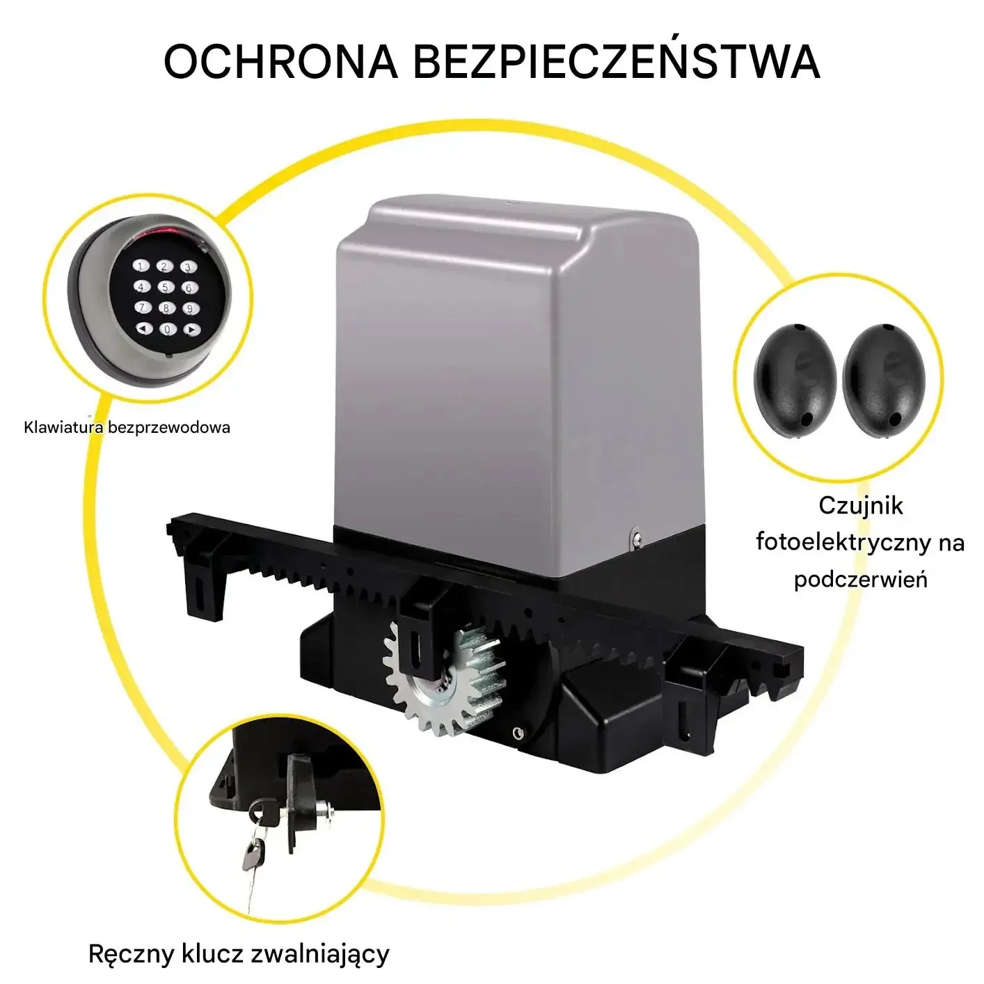 - ✅ Wzmocniona ochrona: Bezprzewodowa klawiatura, czujnik podczerwieni (automatyczne cofanie bramy w przypadku przeszkody) i klucz do ręcznego otwierania.
