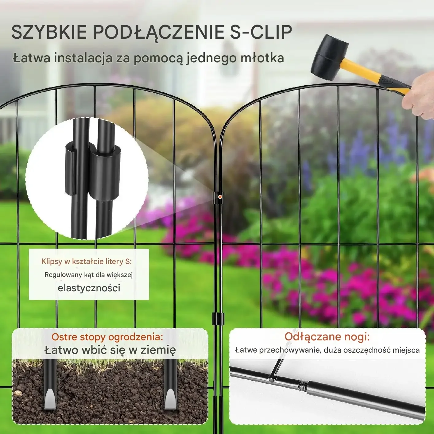 Ostre nóżki ogrodzenia z łatwością wbijają się w różne rodzaje podłoża, zapewniając stabilne osadzenie. Połączenie za pomocą klipsów w kształcie litery „S” jest proste i intuicyjne, nie wymaga specjalistycznych narzędzi. Wystarczy zapiąć klipsy „S”, aby szybko zainstalować ogrodzenie, które bez trudu dopasowuje się do różnych krajobrazów.