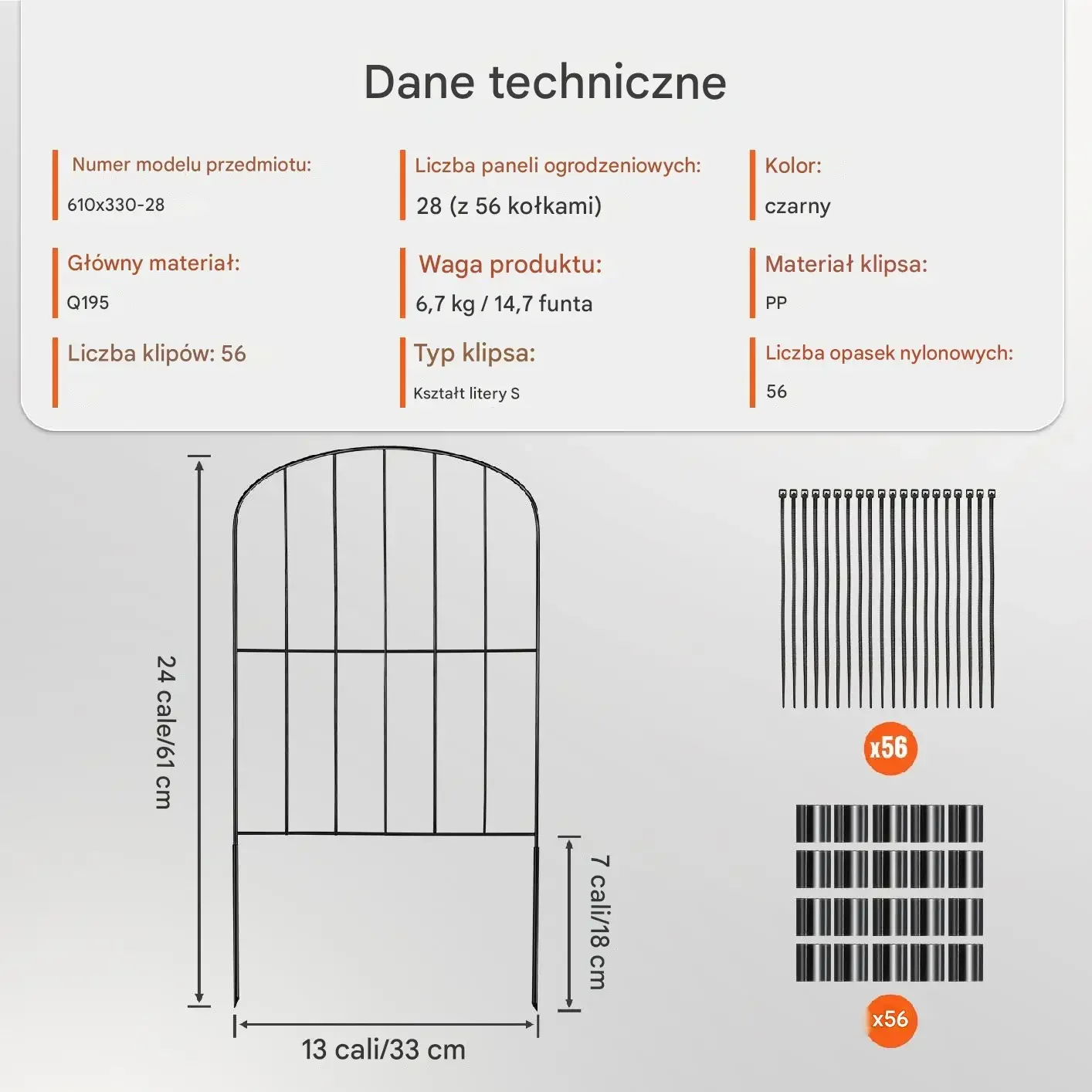 - Liczba paneli ogrodzeniowych: 28 (z 56 kolcami)