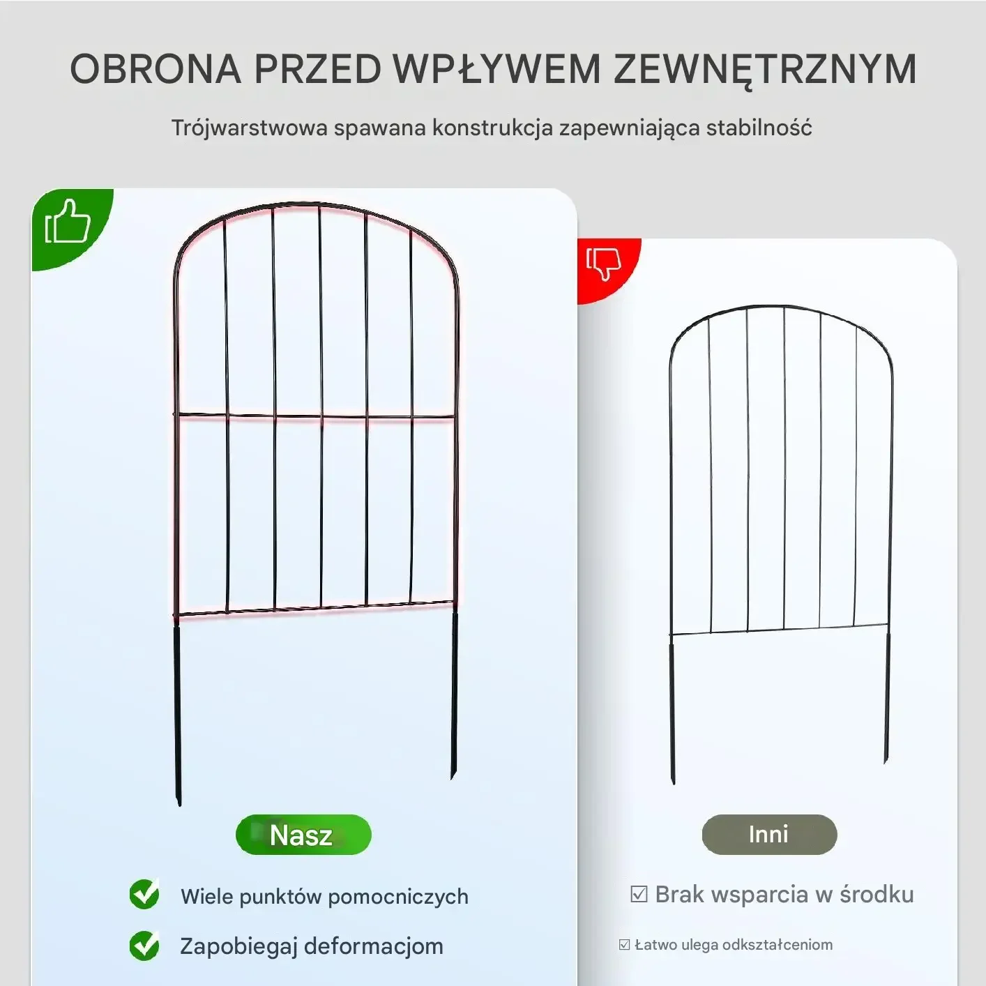 Ogrodzenie jest wykonane z wysokiej jakości stali węglowej, pokrytej powłoką proszkową odporną na rdzę, co zapewnia odporność na korozję i długą żywotność. Podwyższona stabilność i trwałość chronią przed odkształceniami. Konstrukcja odporna na trudne warunki atmosferyczne na zewnątrz.