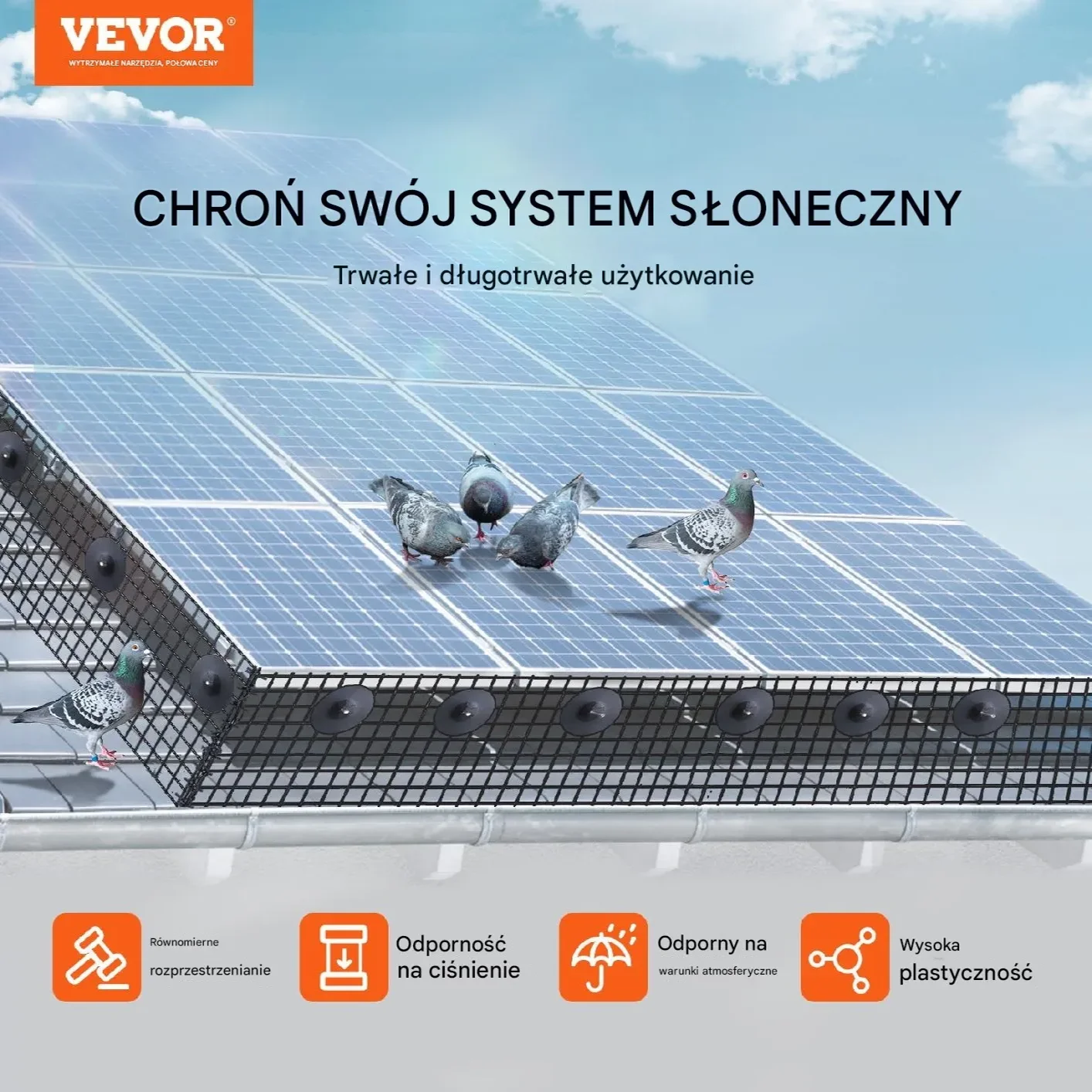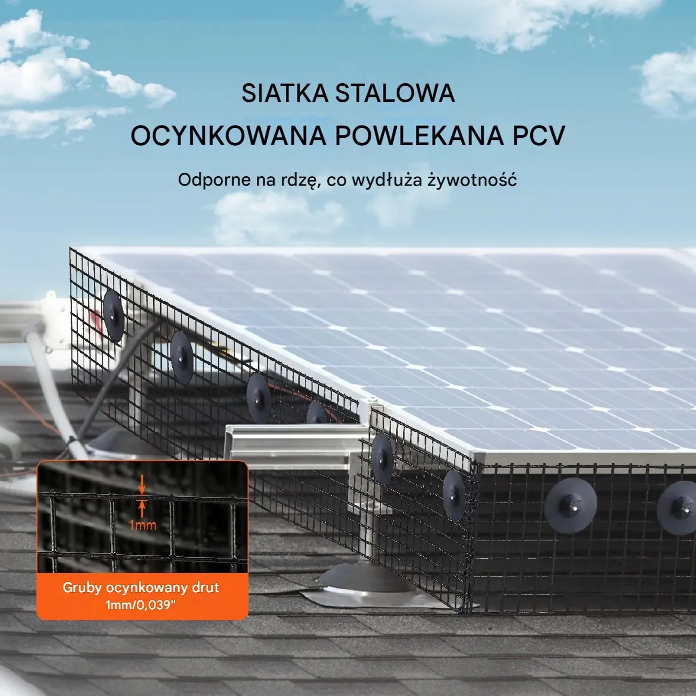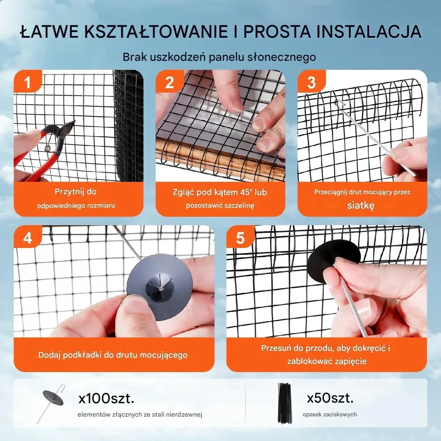 Siatka przeciw ptakom na panel słoneczny o wymiarach 15 cm x 3048 cm pokryta PVC może być łatwo cięta, gięta i kształtowana w celu dopasowania do różnych miejsc instalacji. Jednoetapowa instalacja, wraz z 50-częściowymi drutami oponowymi, zapewnia bezpieczne dopasowanie wokół panelu słonecznego.