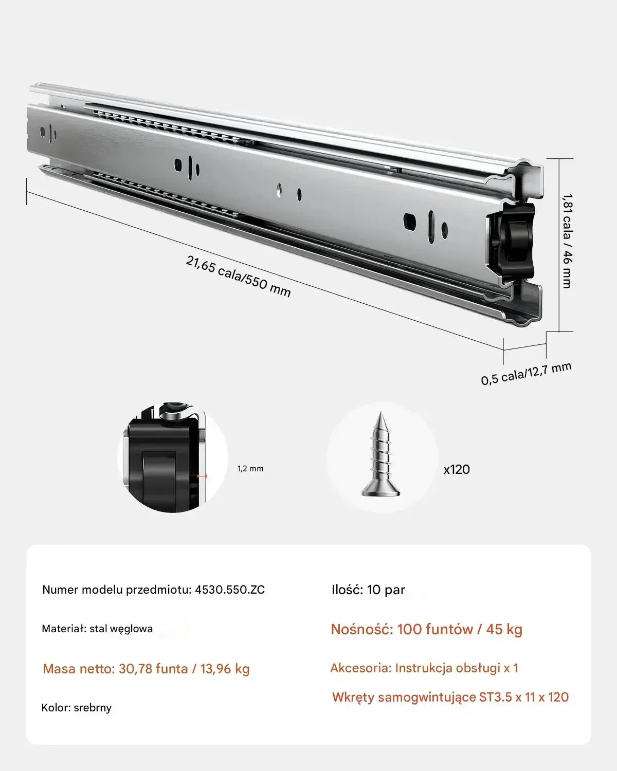 - Wymiary (wysokość x szerokość x długość): 47 mm x 920 mm x 2110 mm