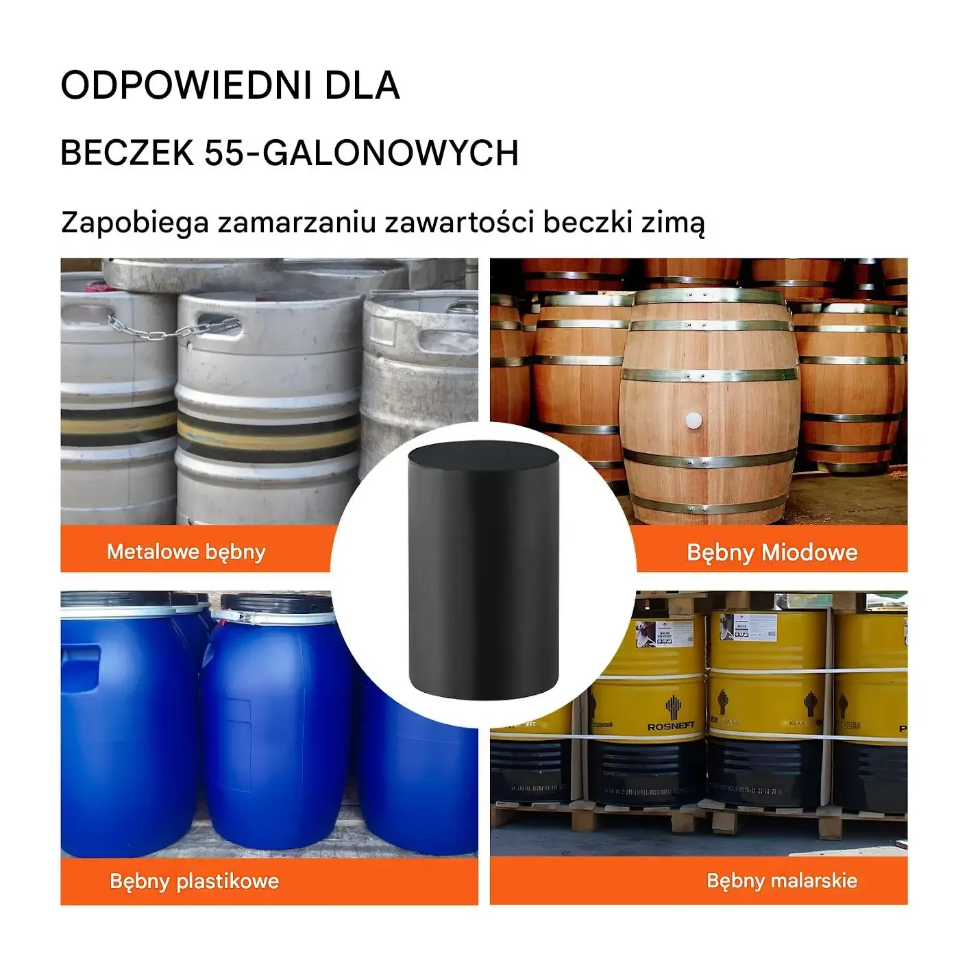 Przeznaczony dla beczek 55-galonowych do zapobiegania zamarzaniu zawartości; skutecznie utrzymuje temperaturę w beczkach metalowych bębnach i plastikowych, w tym also bębny malarskie.