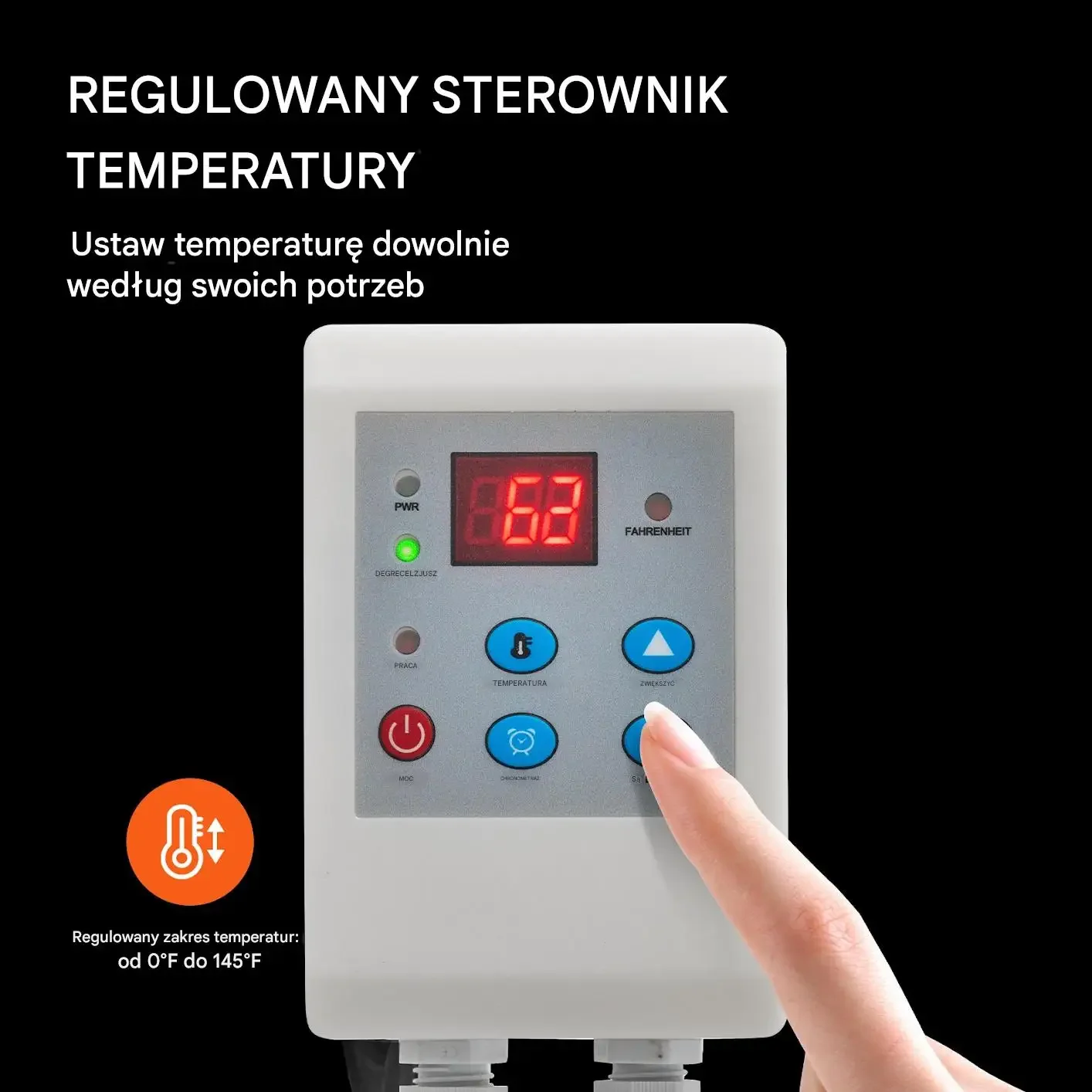 Zakres regulacji temperatury: 0°F-145°F / -17,78°C-62,78°C. Zakres temperatury roboczej: -22°F-140°F / -30°C-60°C.