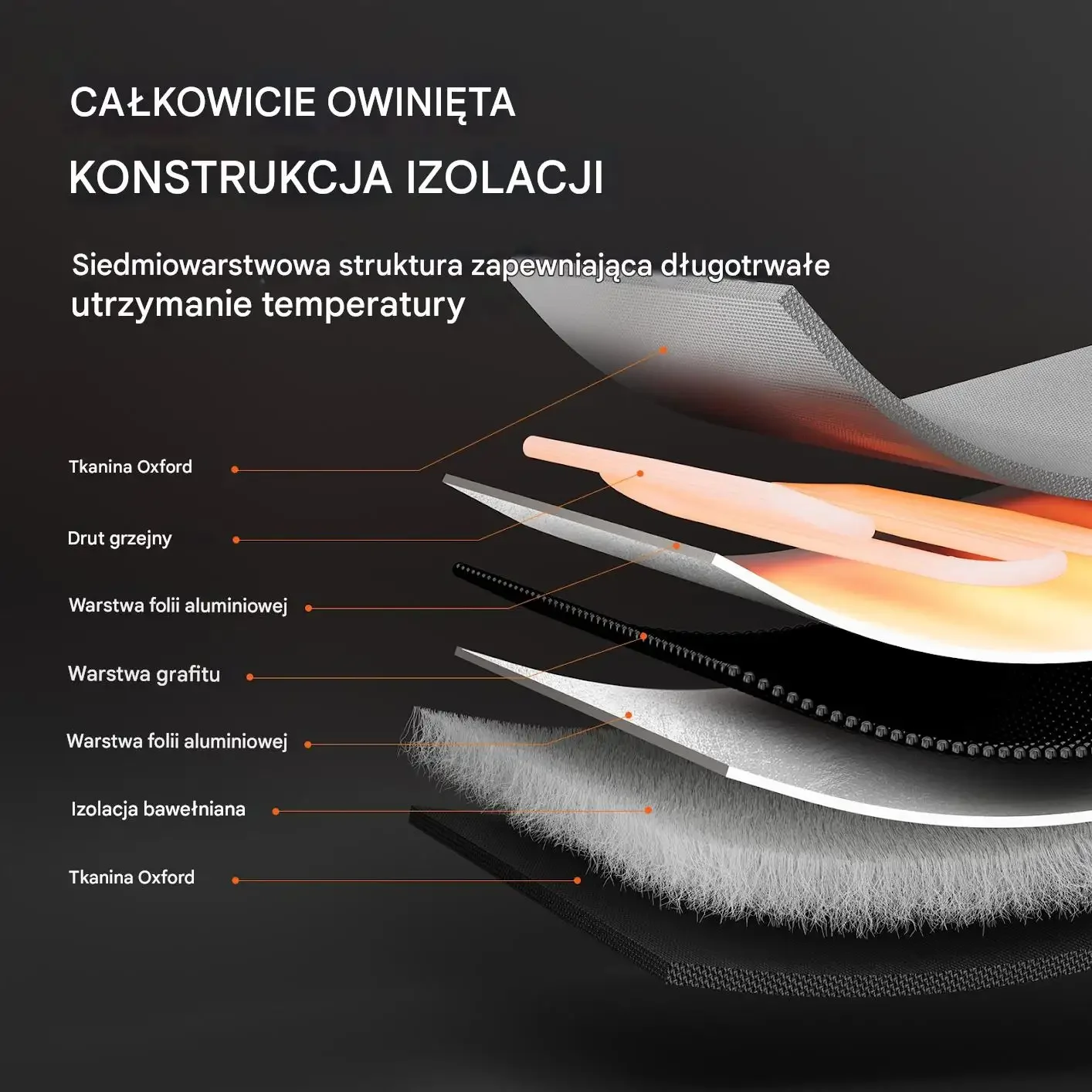 Tkanina Oxford, drut grzejny, warstwa foli aluminiumowej, warstwa grafitu, warstwa folii aluminiowej, izolacja bawełniana, tkanina Oxford.