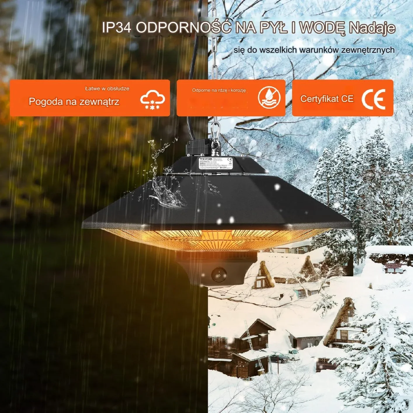 - ✅ Stopień ochrony IP34 – odporność na deszcz i śnieg, sprawdzone certyfikatem CE