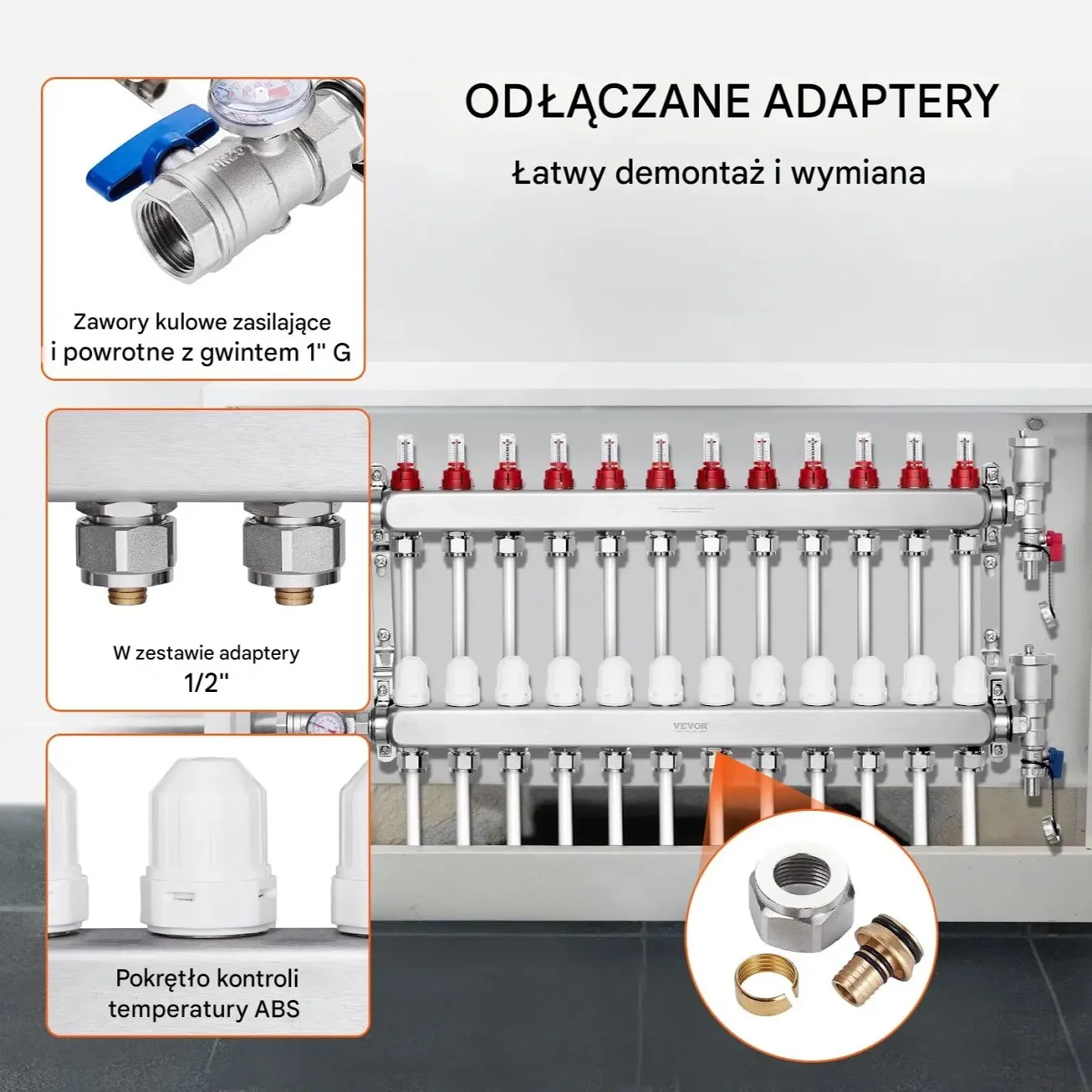 Rozdzielacz ogrzewania podłogowego 12 obw. PEX 1/2 stal z adapterami