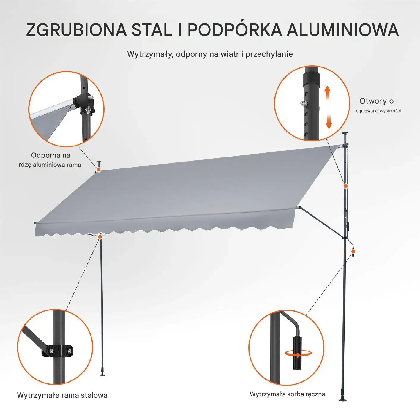 Łatwa regulacja: Ręczna korbka umożliwia płynną regulację kąta nachylenia od 0° do 90° oraz wysokości od 220 cm do 310 cm, dostosowując markizę do indywidualnych potrzeb użytkownika.