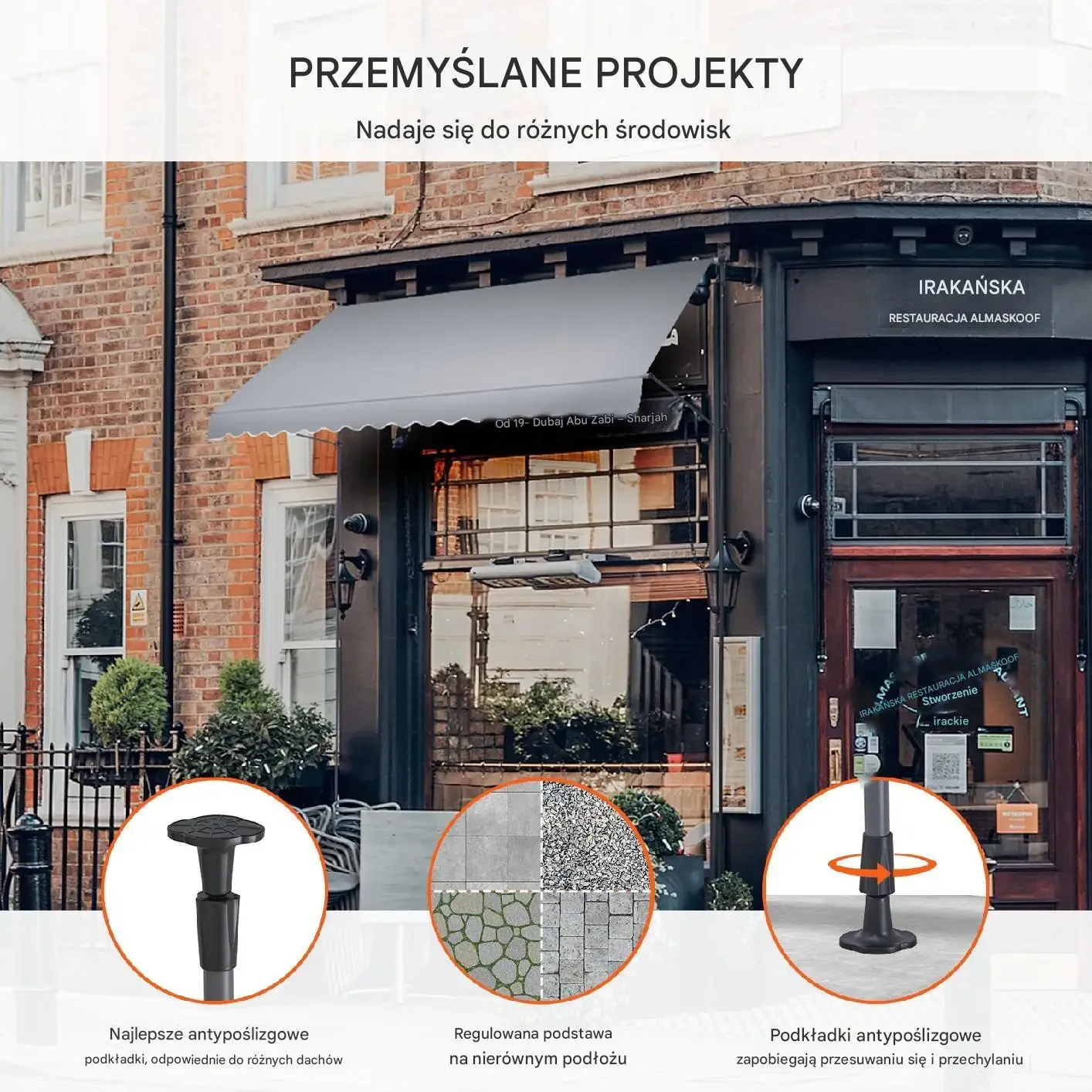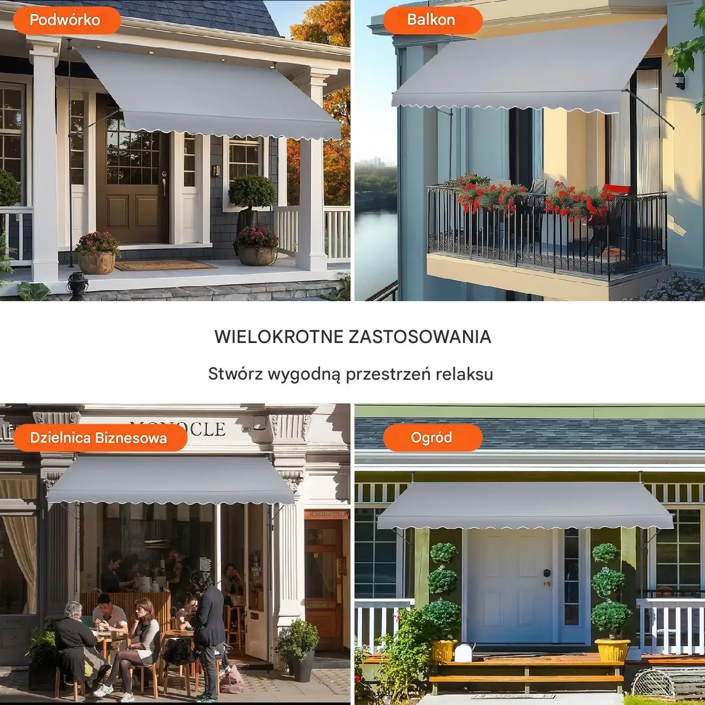 Produkt przeznaczony do tworzenia zadaszenia w wielu zastosowaniach: balkonach, tarasach, dzielnicach biznesowych (działalność komercyjna) oraz w ogrodach. Zestaw obejmuje mechanizm regulacji, podstawowe elementy montażowe oraz możliwość instalacji na różnych podłożach – idealny do domów i lokali usługowych.