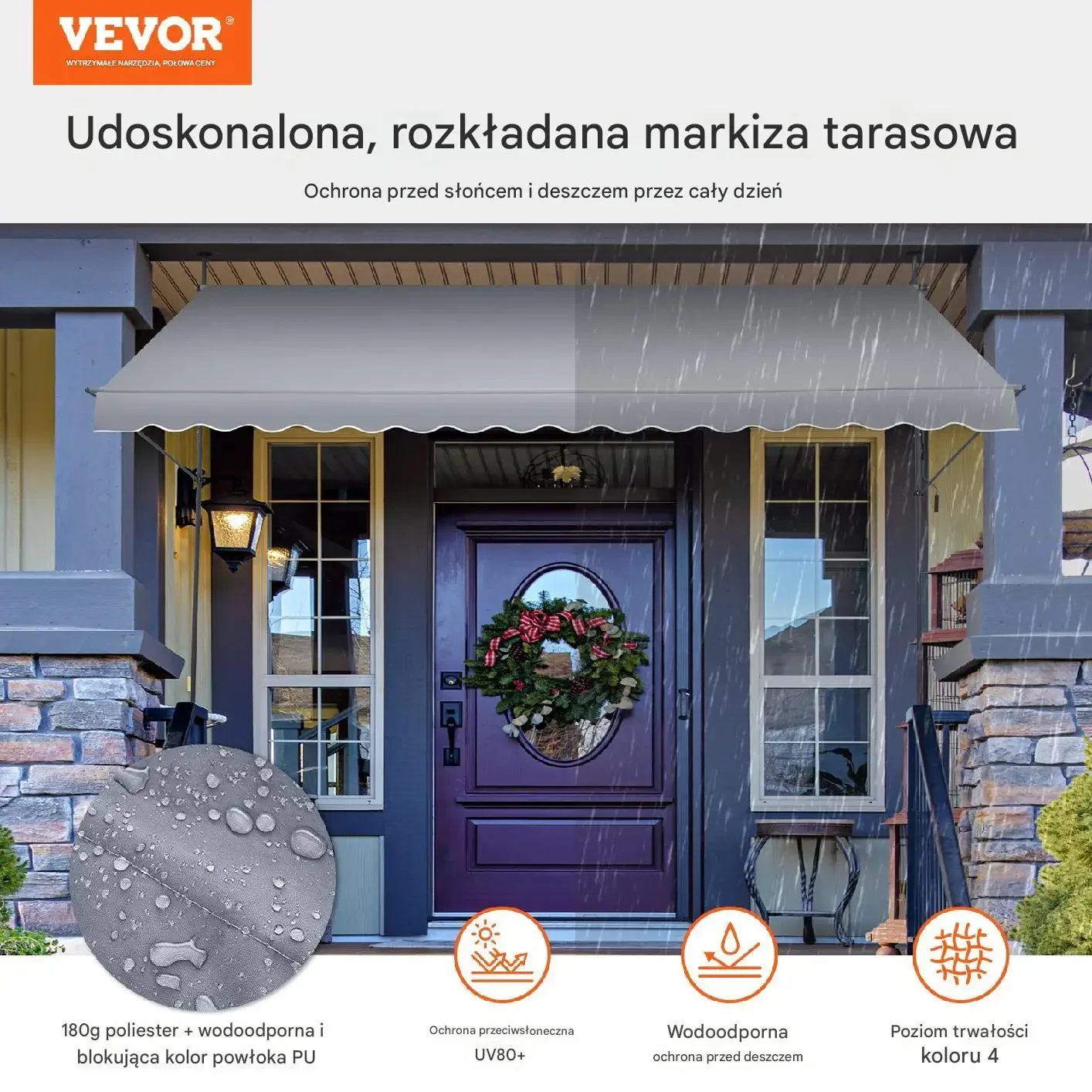 Wysoka jakość materiałów: Markiza wykonana jest z trwałego poliestru o gramaturze 180 g/m², pokrytego wodoodporną powłoką PU, co zapewnia ochronę przed promieniowaniem UV na poziomie UV80+ i lekkimi opadami deszczu.