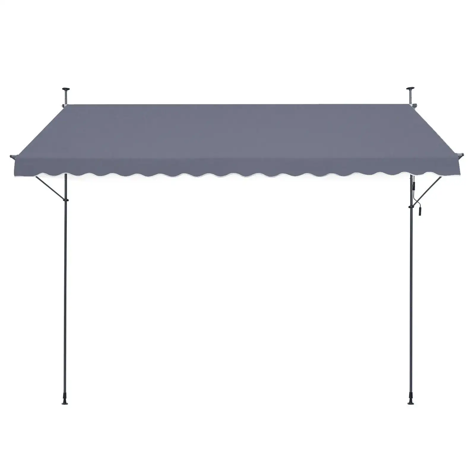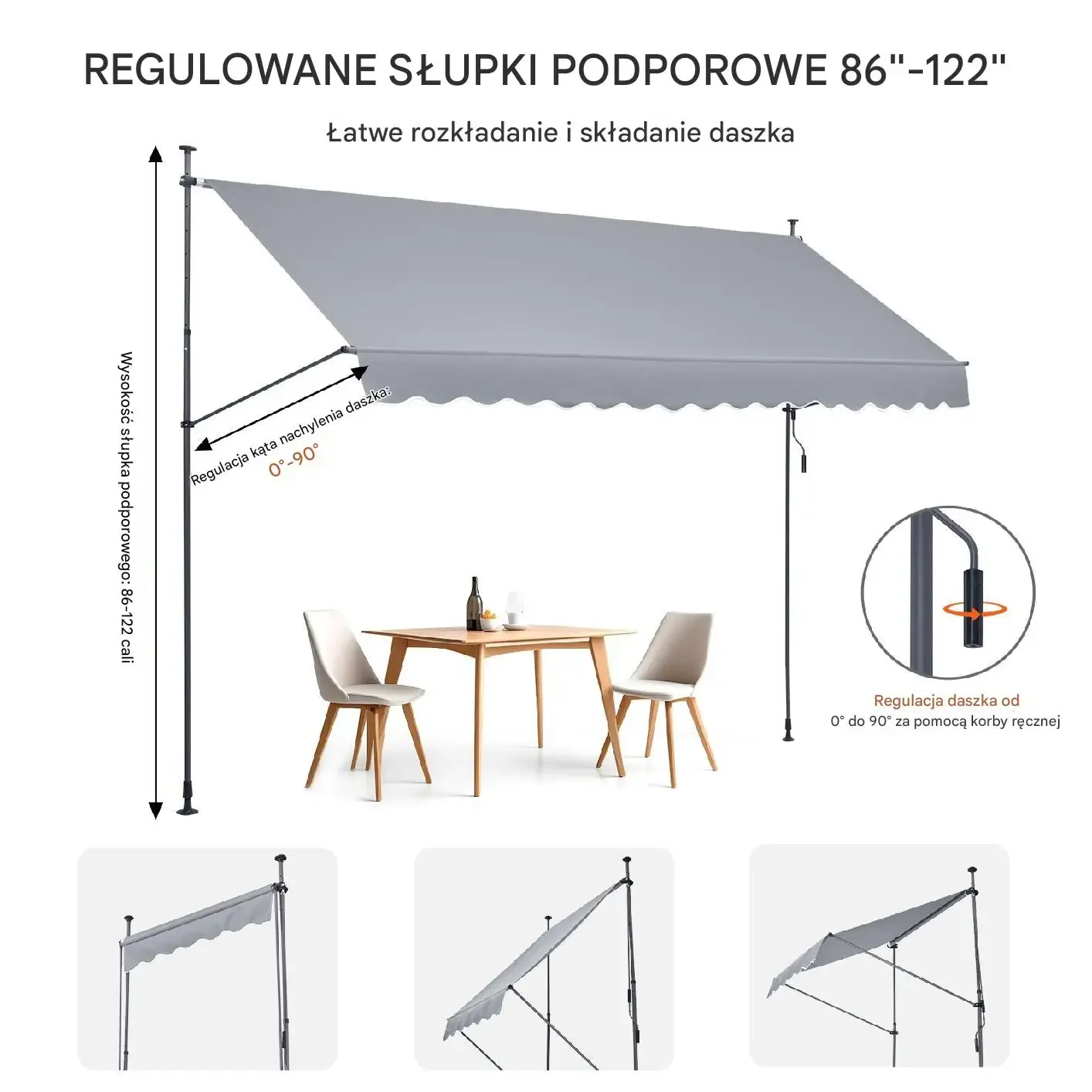 System markizowy z regulowanym kątem nachylenia daszka od 0° do 90°, sterowany ręcznie za pomocą korby. Daszek wykonany z materiału PU, odporny na deszcz, UV i blaknięcie koloru. Konstrukcja wyposażona w solidne słupki podtrzymujące, możliwość składania daszka i łatwej instalacji w różnych lokalizacjach.