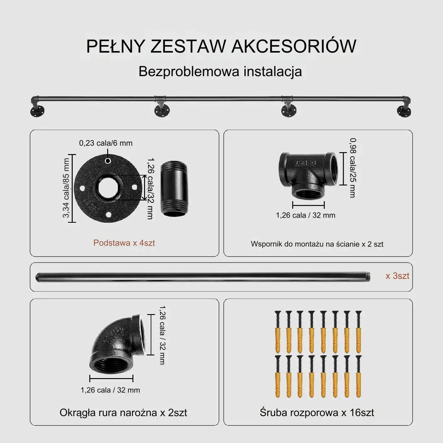 - ✅ Kompletny zestaw wsporników i akcesoriów montażowych – ułatwia szybki i stabilny montaż na ścianie