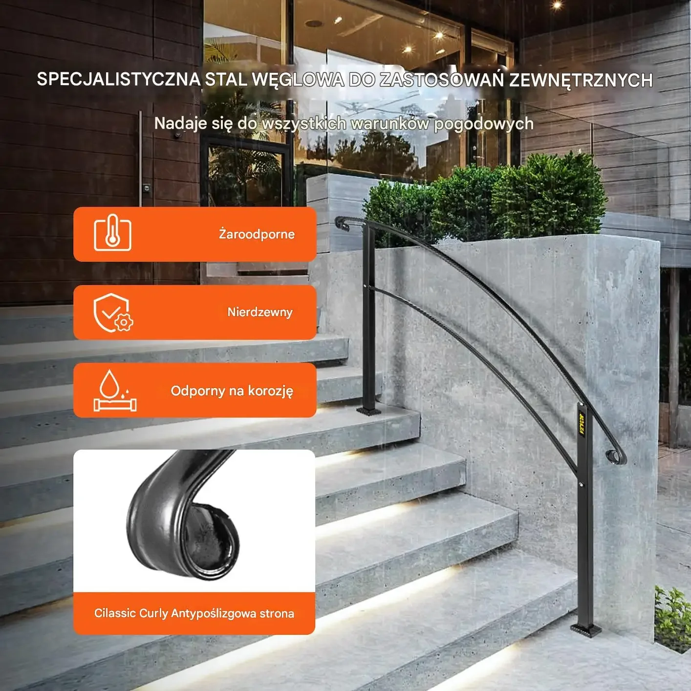 Specjalistyczna stal węglowa do zastosowań zewnętrznych. Nadaje się do wszystkich warunków pogodowych. Żaroodporne wykonanie. Nierdzewne elementy. Odporność na korozję. Classic curly — antypoślizgowa strona poręczy.