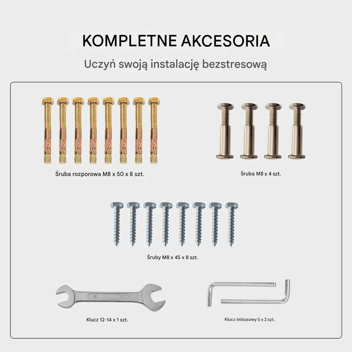 - Szybki montaż bez specjalistycznych narzędzi: Kompletny zestaw montażowy pozwala na sprawną instalację