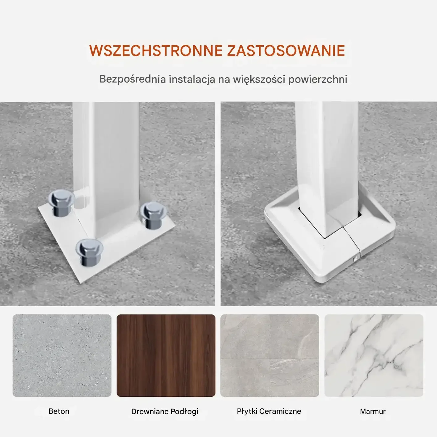 Możliwość bezpośredniej instalacji na różnych powierzchniach, takich jak beton, drewniane podłogi, płytki ceramiczne i marmur, co sprawia, że produkt jest niezwykle wszechstronny.
