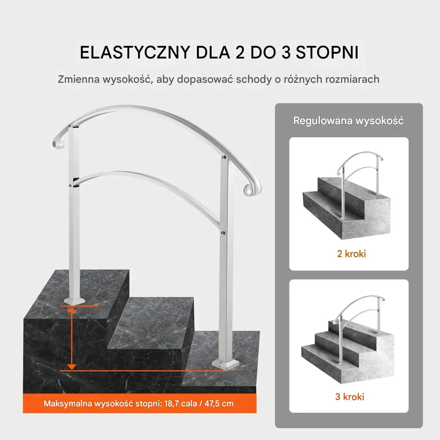 - ✅ Dopasowanie do 3 stopni: regulowana wysokość do 47,5 cm, rozstaw słupków 63,5 cm, wysokość górnego słupka 97 cm, dolnego 106 cm