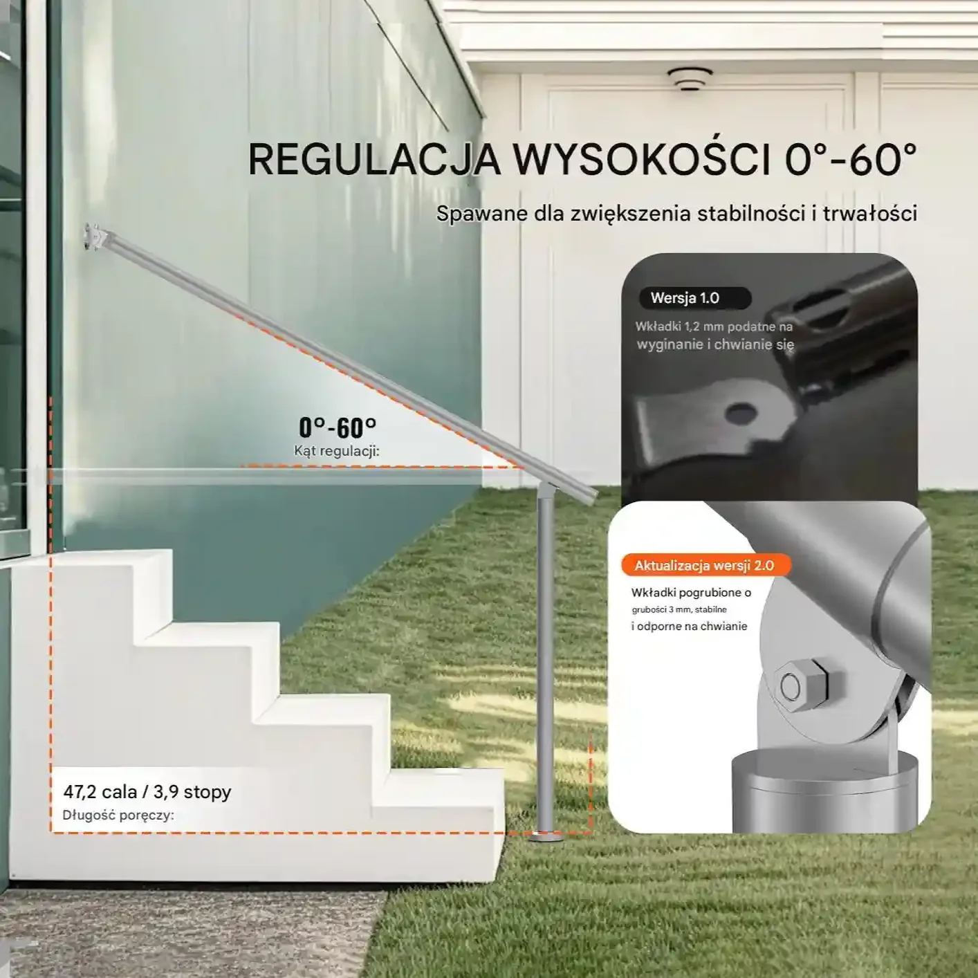 - ✅ Regulowany kąt nachylenia: Zakres 0°–60° umożliwia dopasowanie poręczy do różnych typów schodów i wejść.