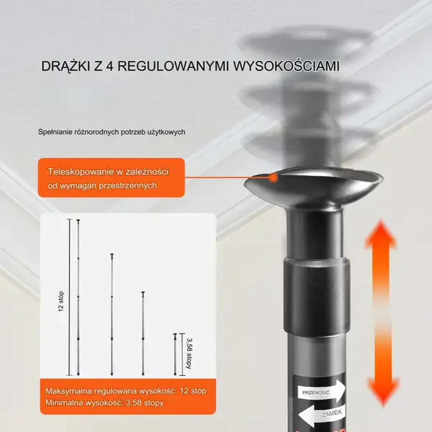 - ✅Regulowana wysokość do 3,05 m: Teleskopowa konstrukcja pozwala na elastyczne dopasowanie do różnych wysokości pomieszczeń, zapewniając uniwersalność.