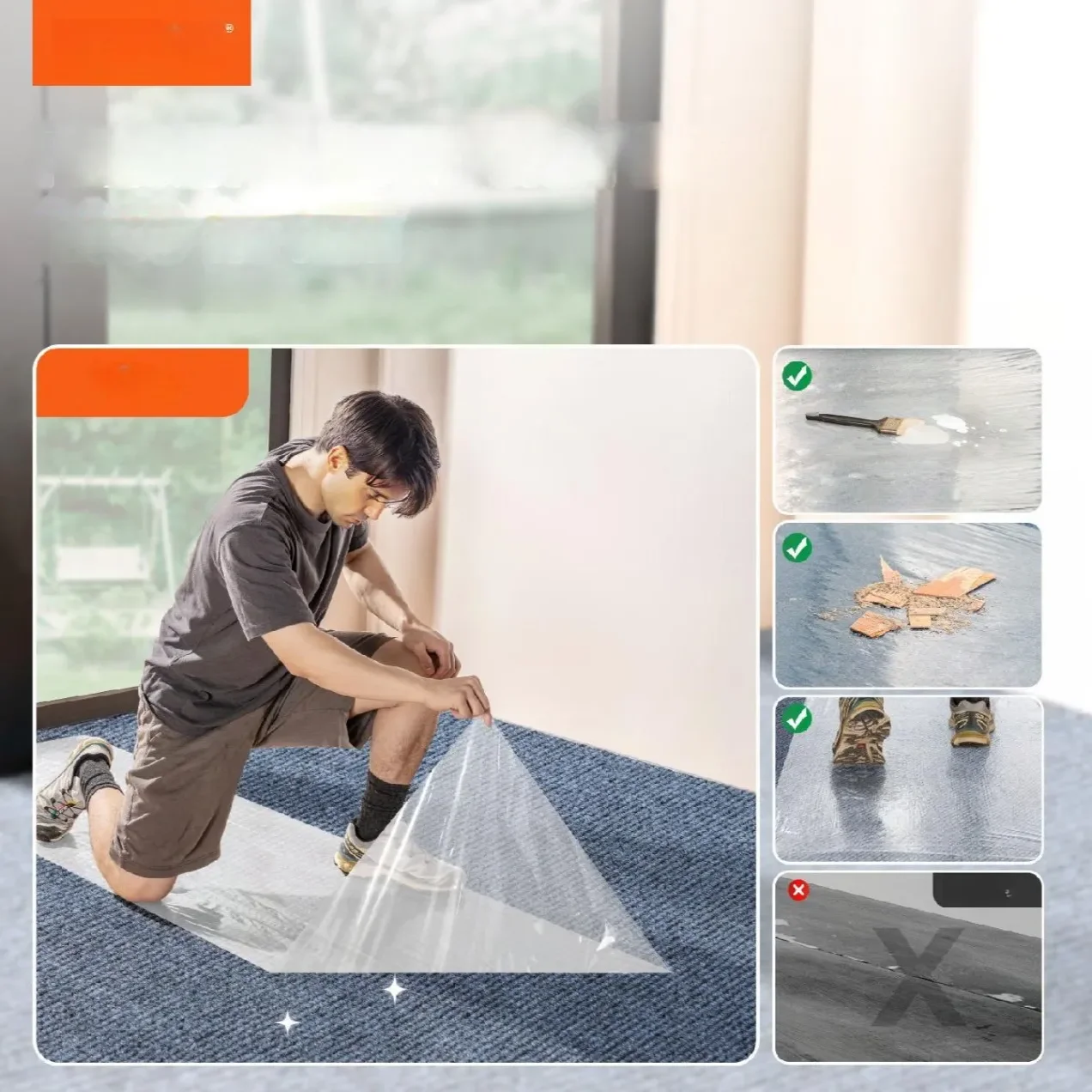 Wysokiej jakości folia ochronna z polietylenu chroni dywany przed farbą, śladami stóp i zadrapaniami ostrymi przedmiotami, utrzymując dywan w idealnym stanie. Pokrycie 9,29 m² (100 stóp kwadratowych) umożliwia ochronę nawet dwóch sypialni, ułatwiając prace dekoracyjne i sprzątanie.