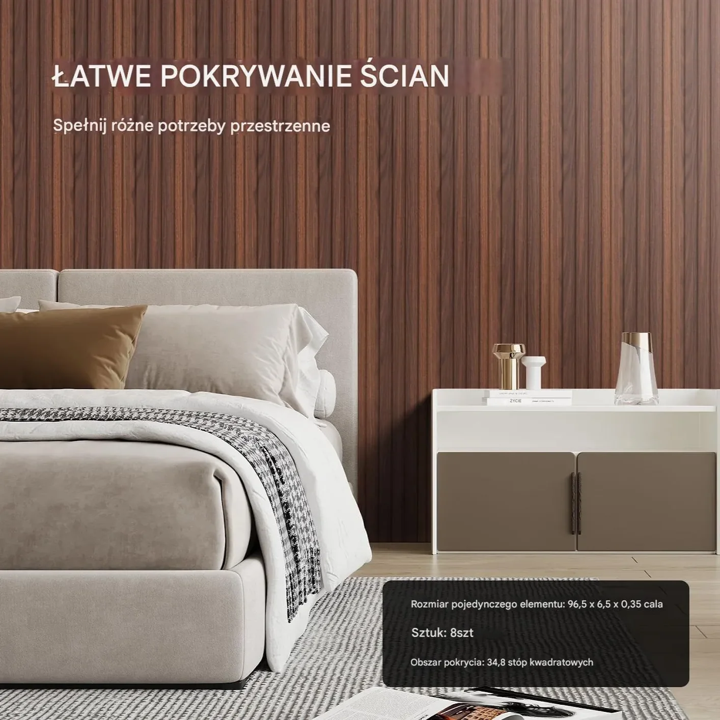 - 8 paneli akustycznych z listwami drewnianymi w kolorze czarnego teku
