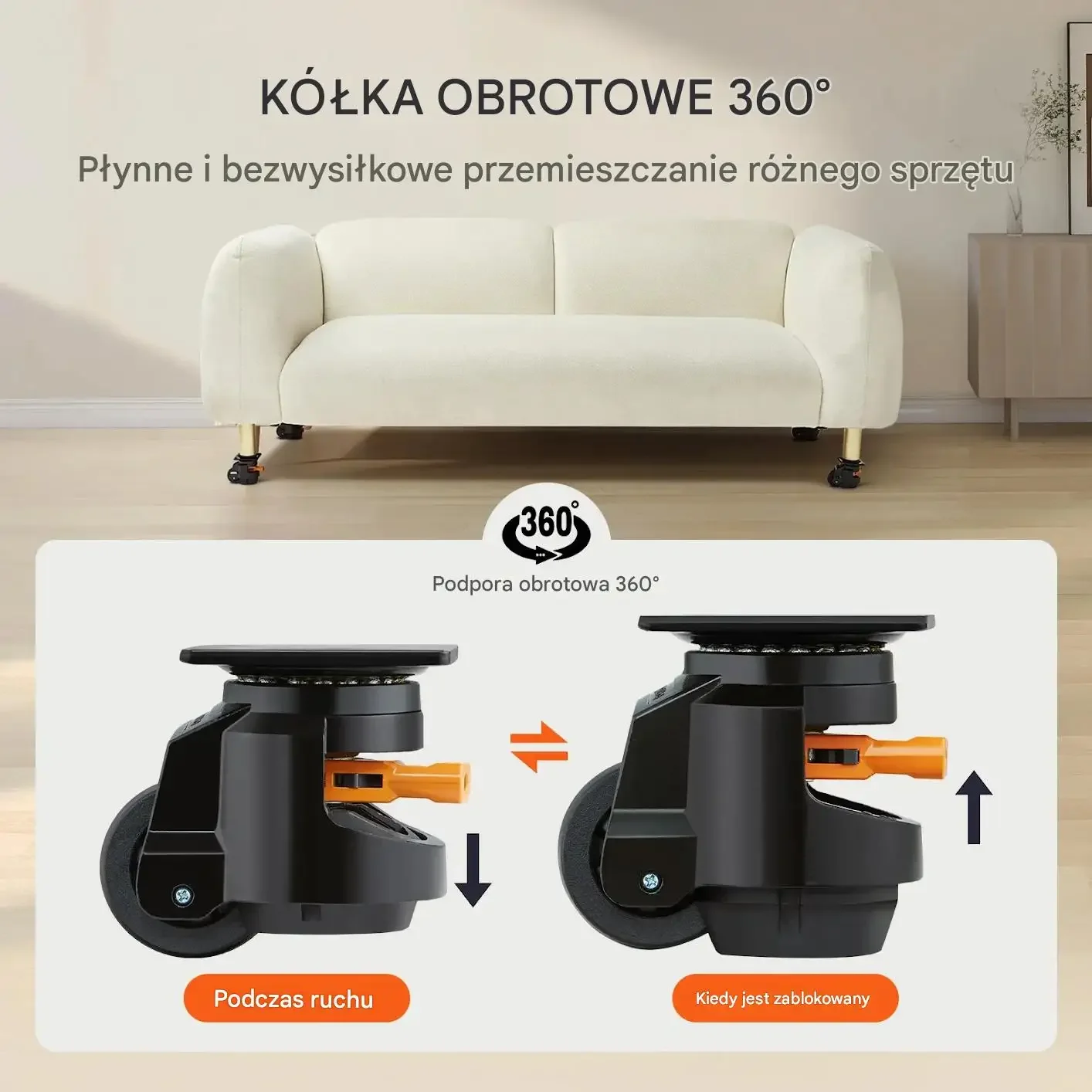 - ✅ Imponujący udźwig: Łączny udźwig do 1000 kg (250 kg na każde kółko), idealne do ciężkich mebli i sprzętu przemysłowego.