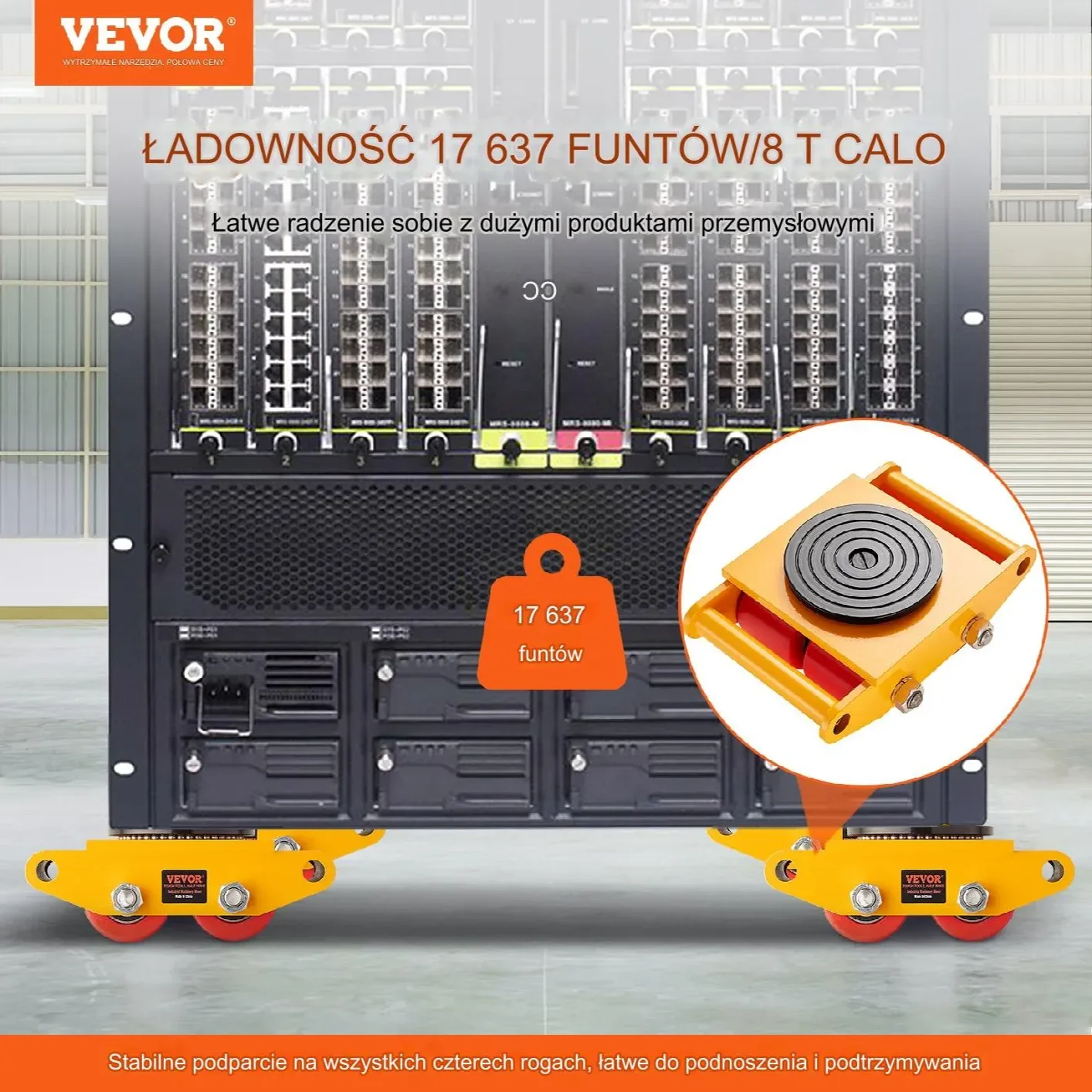 Profesjonalny zestaw 4 wózków transportowych do maszyn o łącznym udźwigu 8000 kg to niezawodne rozwiązanie do przenoszenia ciężkich ładunków w magazynach, warsztatach, zakładach produkcyjnych i na budowach.