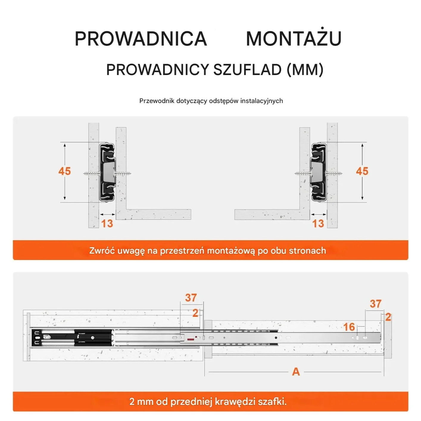 - ✅ Duża nośność 45 kg: Wytrzymałe prowadnice z ocynkowanej stali gwarantują bezpieczne przechowywanie nawet ciężkich przedmiotów.