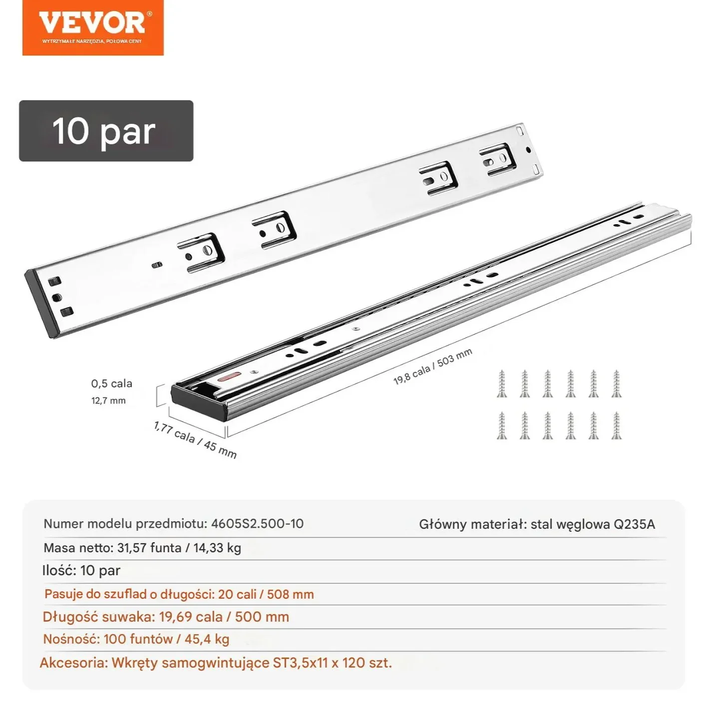 Szyny do szuflad 50cm 10par pełne wysunięcie soft close 45kg kuchnia meble